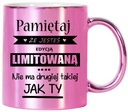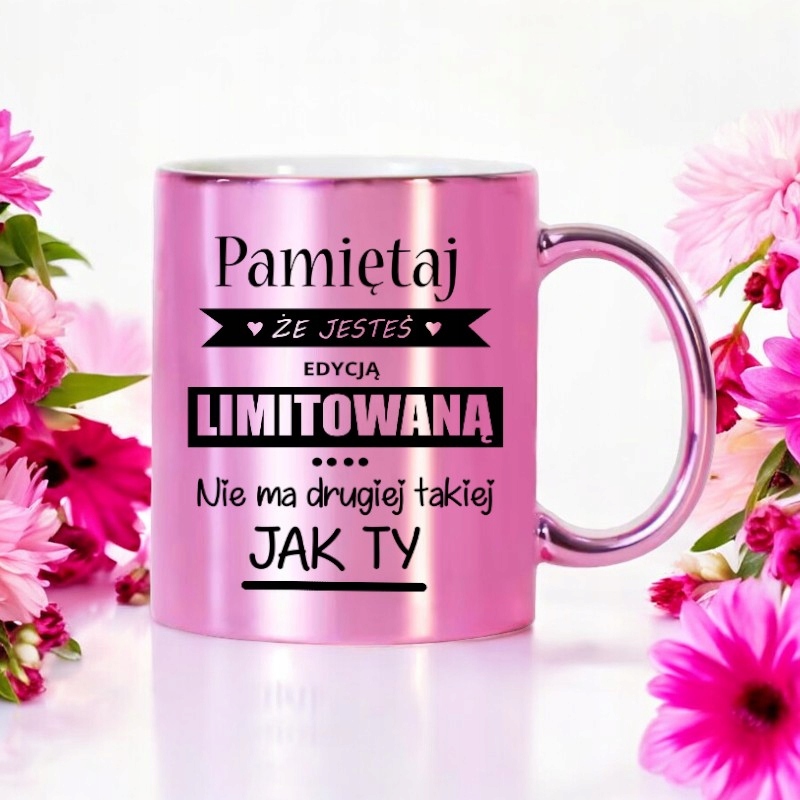 Kubek w kolorze różowym błyszczącym (metalik) z czarnym nadrukiem (nadruk z OBU STRON kubka)