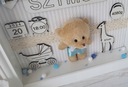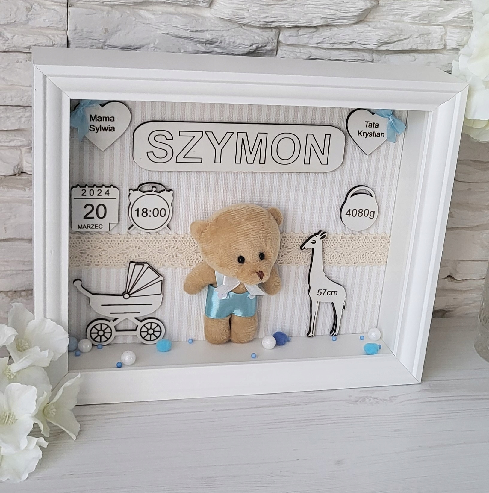 ✅ W środku znajduje się Miś pluszowy ubrany w spodenki na szelkach, a pod szyją ma piękną muchę dedykowany dla chłopca. Dla dziewczynki miś jest w sukience z kwiatkiem na głowie. Tło ramki jest w beżowe paseczki. Na tabliczkach z białego HDF wygrawerowane są :