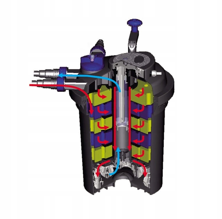 - W przeciwieństwie do zwykłych filtrów, woda z filtra ciśnieniowego może wypływać , być podnoszona nawet do 3m nad filtr np. na kaskadę, strumień (w zależności od zastosowanej pompy)