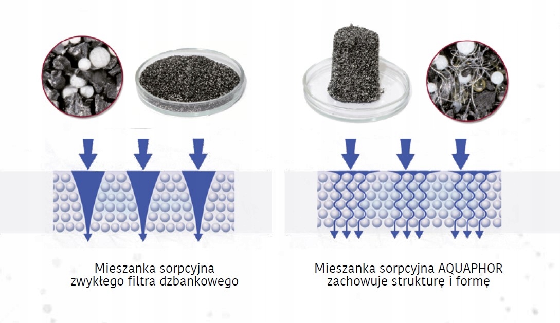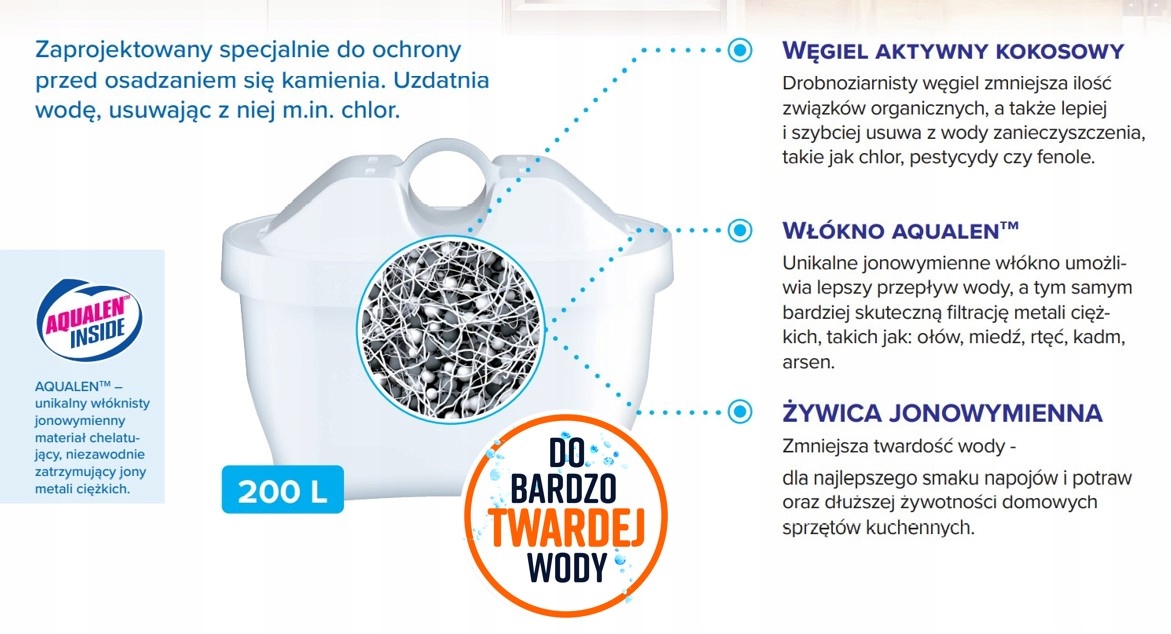 Poprawia smak i zapach wody, zapobiega osadzaniu się kamienia w przypadku wody twardej. Wkład filtrujący skutecznie usuwa z wody chlor, metale ciężkie, żelazo, pestycydy, związki organiczne i inne zanieczyszczenia.