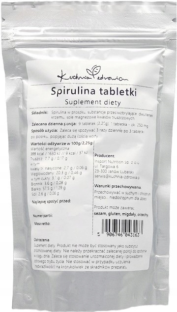 Składniki : Spirulina w proszku, substancje przeciwzbrylające: dwutlenek krzemu, sole magnezowe kwasów tłuszczowych.