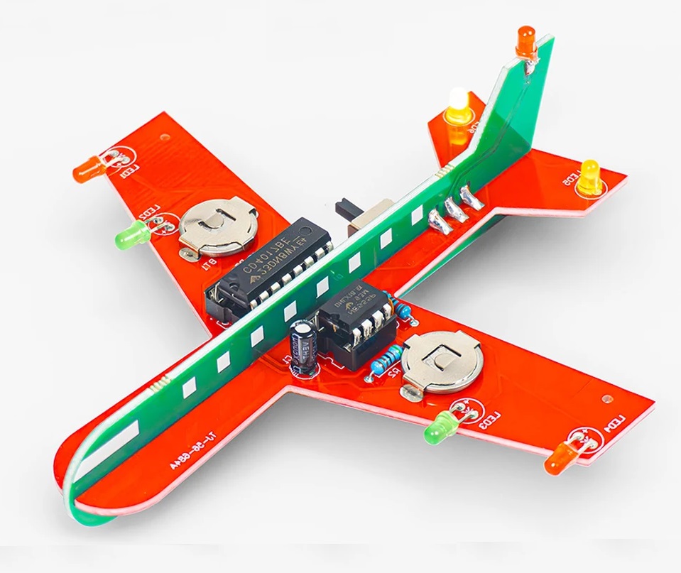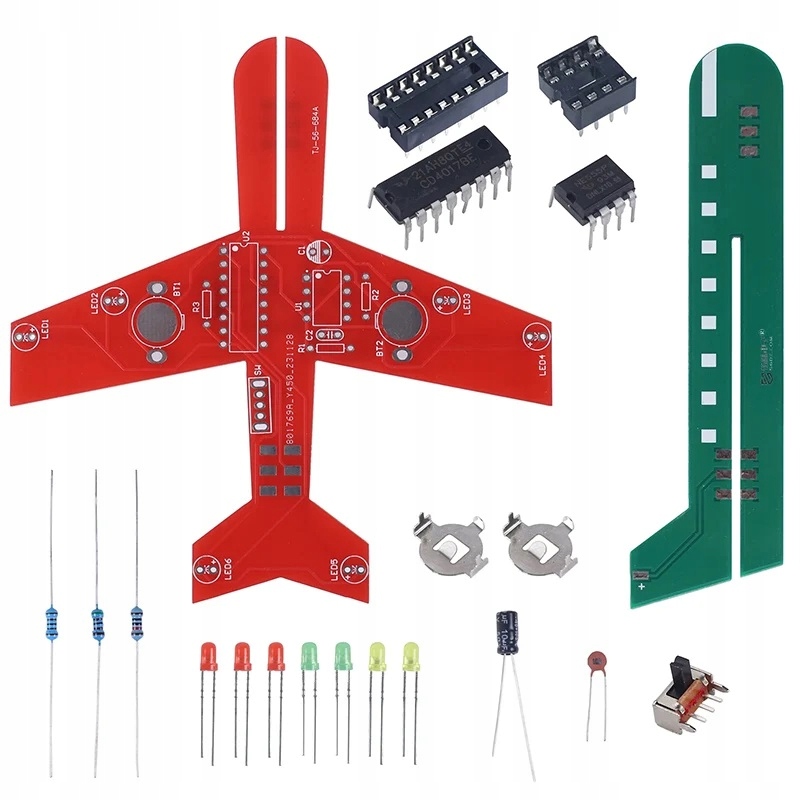 Po zmontowaniu układu i włożeniu baterii diody led zaczną mrugać i naśladować światła jak w prawdziwym samolocie.