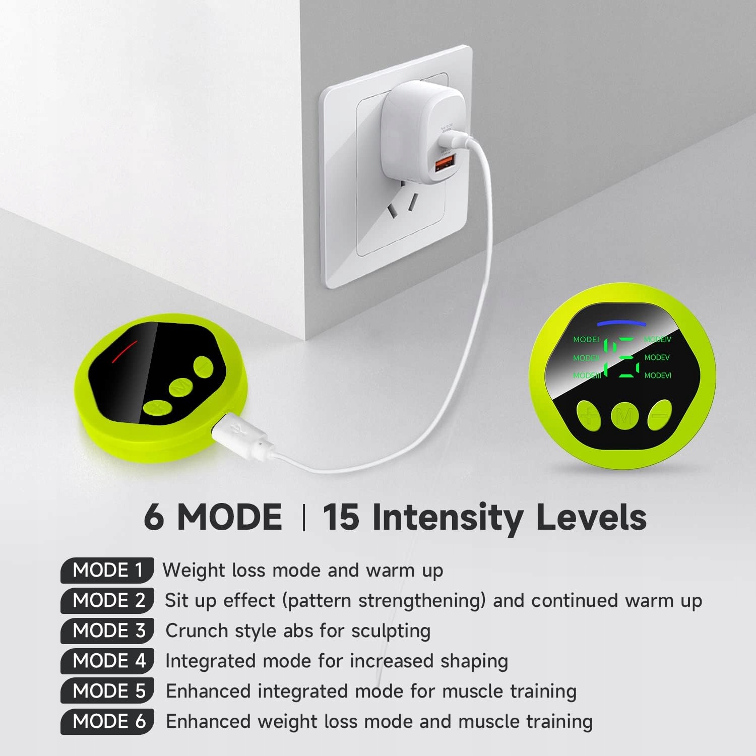 Dostroj swoją sylwetkę przy pomocy naszego pasa brzusznego! Z 6 trybami treningowymi i 15 poziomami intensywności, ten pas do tonizacji brzucha indywidualnie dostosowuje każdy trening do Twoich potrzeb. Trenuj mięśnie brzucha bardziej efektywnie i bezpiecznie, bez męczących ćwiczeń!