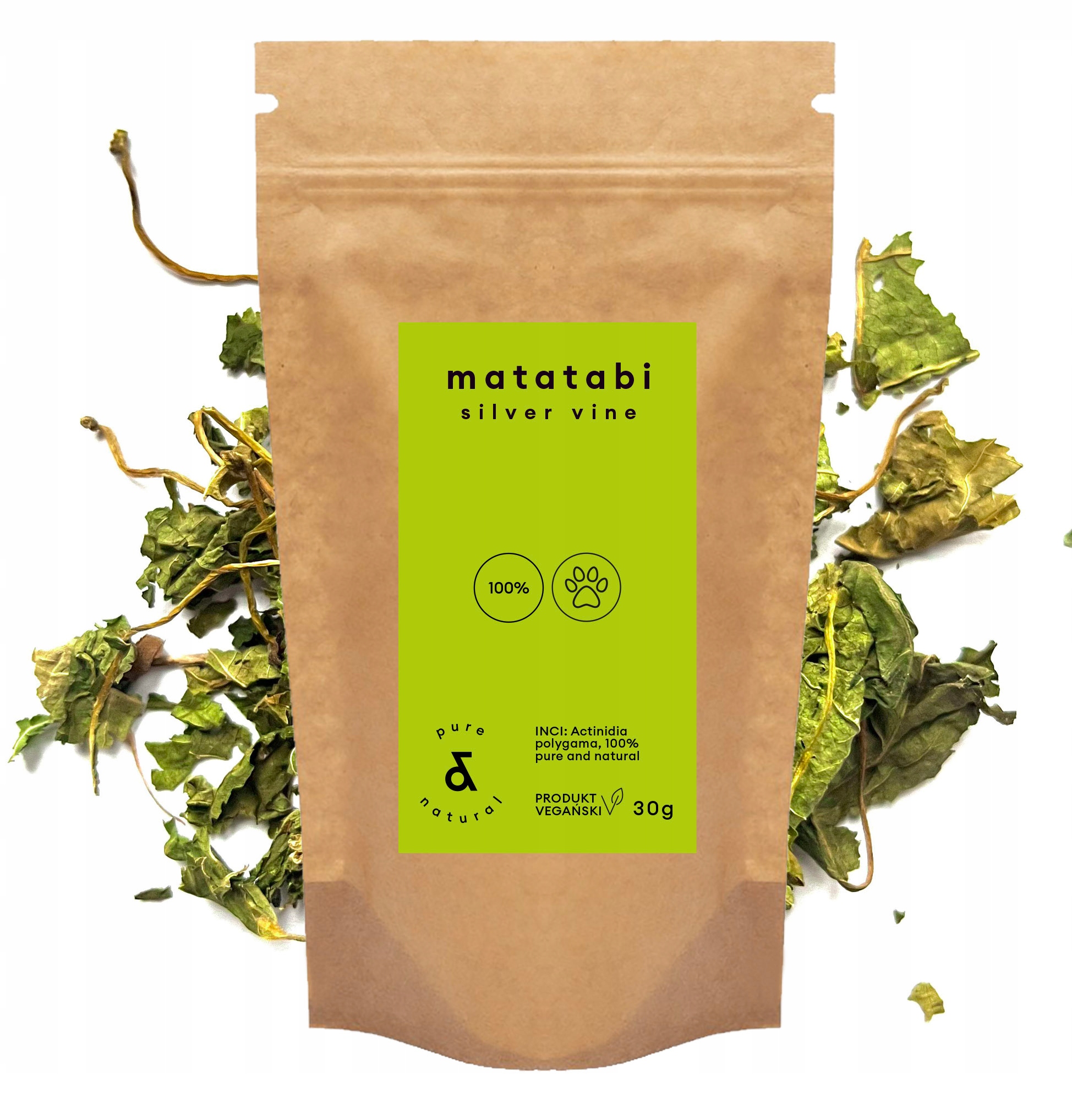 Liście Matatabi, znane również jako liście silver vine, mają na koty podobny wpływ do kocimiętki, ale często są jeszcze bardziej intensywne (liście matatabi są kilkukrotnie silniejsze). Działają nawet na koty odporne na kocimiętkę!