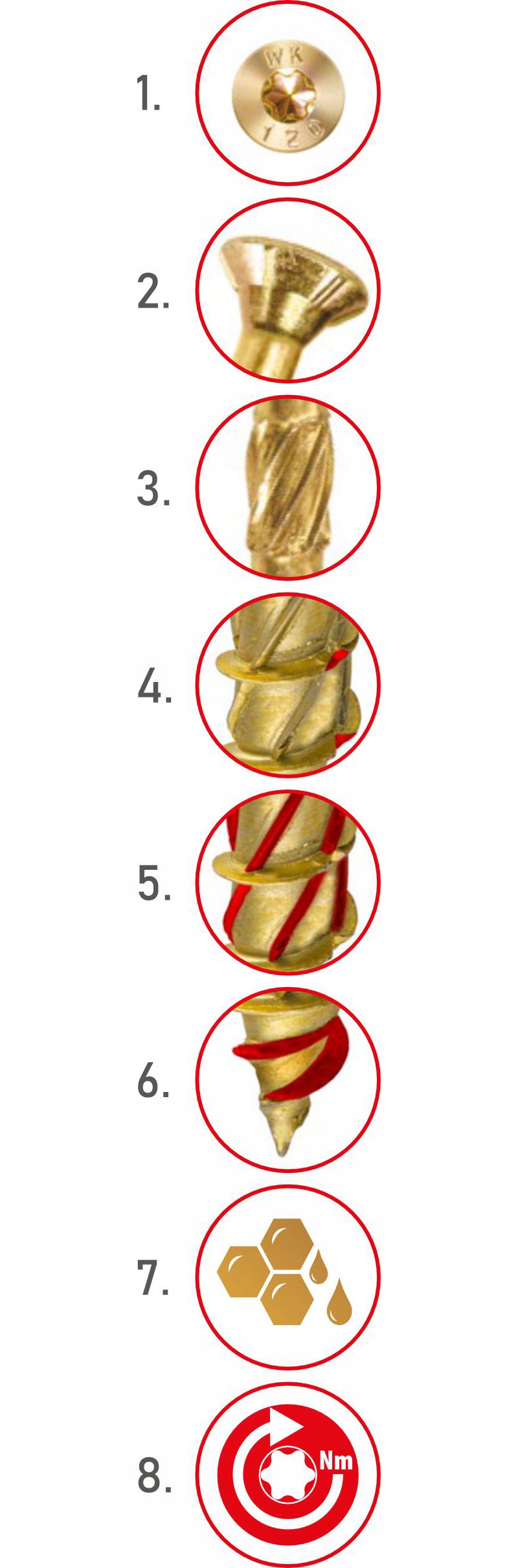 Wkręty WKCS przeznaczone są do połączeń elementów drewnianych i drewnopochodnych (płyta wiórowa, sklejka, drewno, płyta OSB, płyta MDF). Innowacyjna konstrukcja sprawia że praca z nimi to czysta przyjemność. Nie wymają wcześniejszego nawiercania. Głębokie i stabilne gniazdo TORX efektywnie przenosi moment obrotowy bez efektu wyskakującego bitu.
