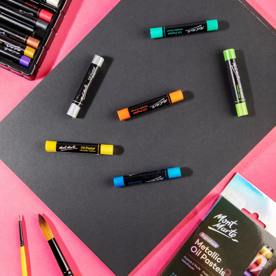 Twórz przyciągające wzrok dzieła sztuki za pomocą naszych metalicznych pasteli olejnych 12 szt. W zestawie znajduje się 12 połyskujących metalicznych pasteli o bogatych kolorach i miękkiej, maślanej konsystencji. Ten zestaw pasteli artystycznych doskonale nadaje się do mieszania kolorów na różnych gładkich i teksturowanych powierzchniach. Baw się dobrze, eksperymentuj i twórz wzory, desenie i techniki. Dodatkowo, możesz tworzyć glazury, mieszając pastele z olejnymi mediami lub terpentyną, aby uzyskać błyszczący efekt akwareli. Wypróbuj nasz zestaw metalicznych pasteli olejnych do swojego kolejnego arcydzieła.
