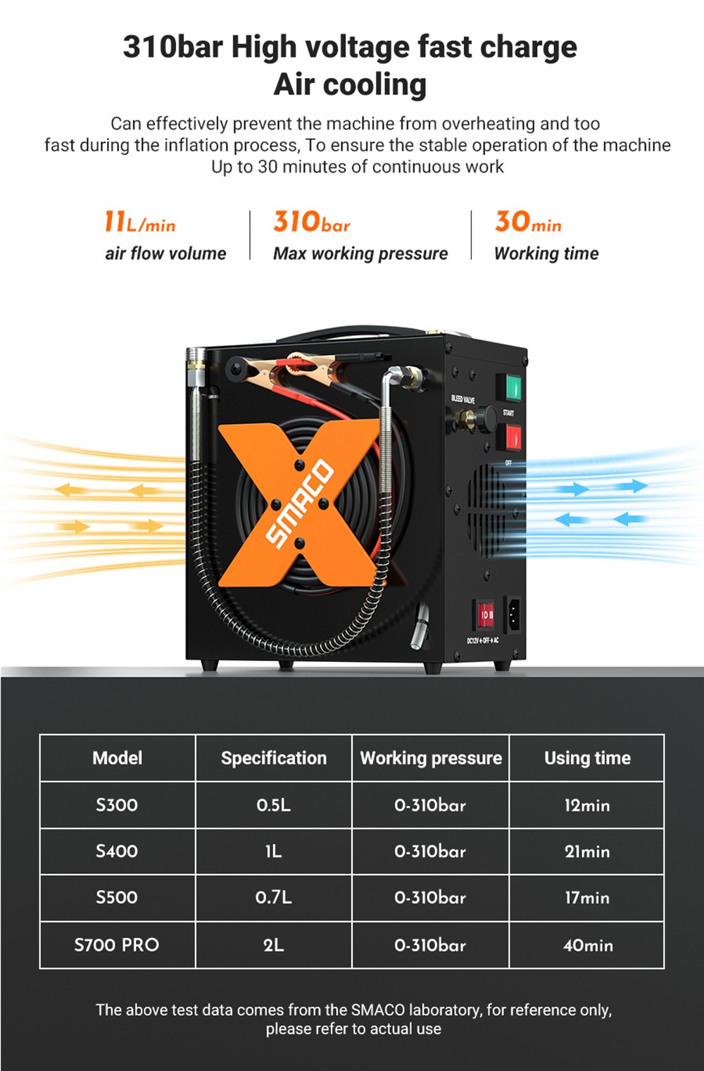 Pod napięciem roboczym (12 V DC lub 110/220 V AC) prędkość silnika może osiągnąć 2700 obr./min, a wydajność powietrza wynosi 11 l/min. Napełnienie pojemnika 0,5 l od 0 Psi do 3000 Psi zajmuje 11 minut; napełnienie pojemnika 1 l od 0 Psi do 3000 Psi zajmuje 26 minut; napełnienie pojemnika 2 l od 0 Psi do 3000 Psi zajmuje 46 minut.