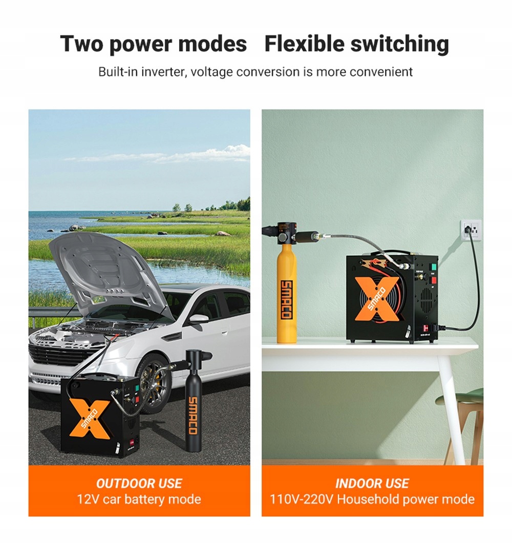Ten kompresor powietrza może być zasilany z akumulatora samochodowego 12 V DC lub z domowego 110 V-220 V. Posiada wbudowane urządzenie do konwersji napięcia inwertera i można go łatwo regulować z 110 V na 220 V AC zgodnie z normalną sytuacją użytkownika. Średnica interfejsu inflacyjnego wynosi 8 mm.