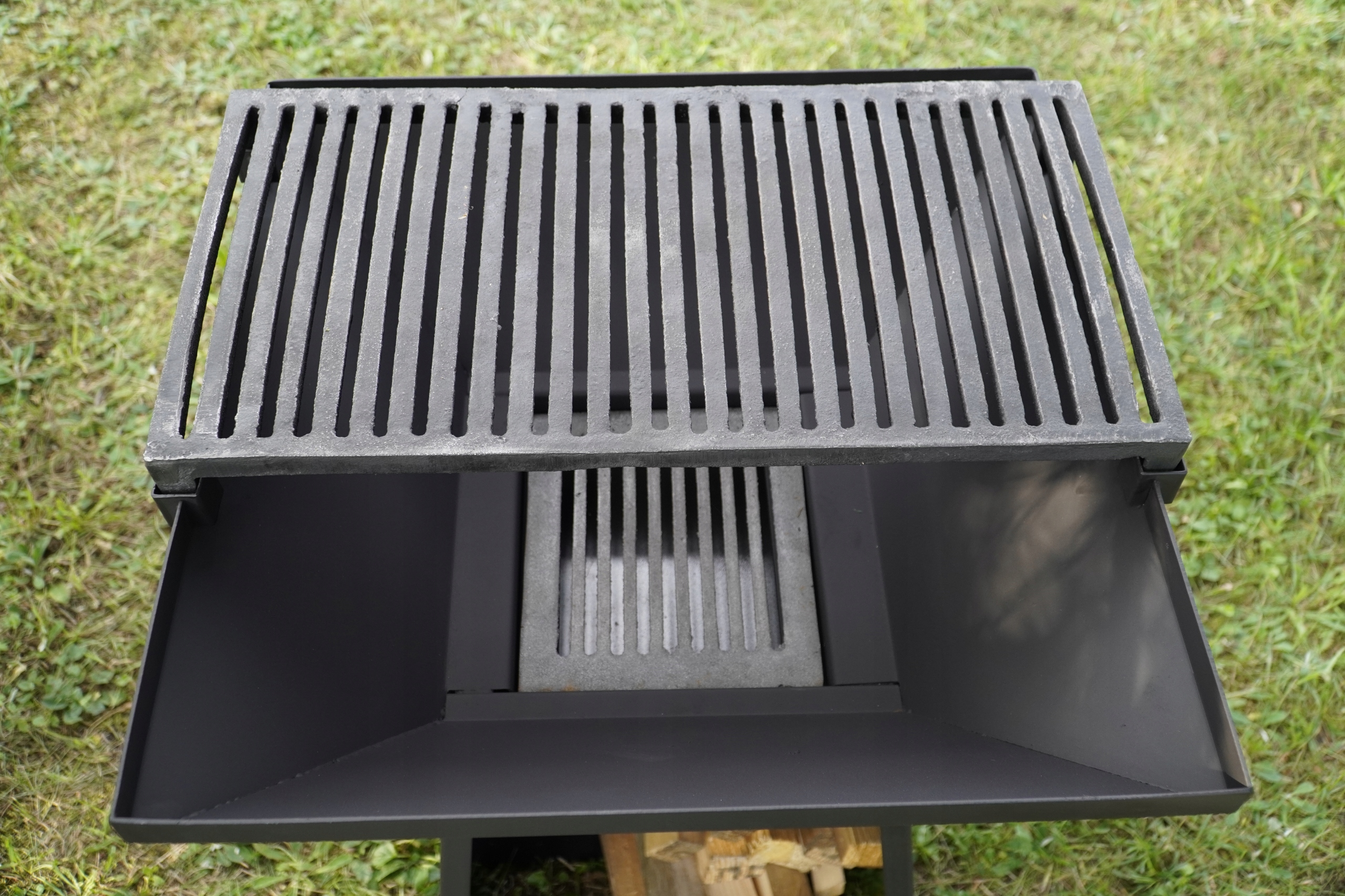 Топка имеет чугунную решетку размером 22 см x 19 см толщиной 1 см. Под решеткой находится ящик для золы, облегчающий очистку очага. Под ящиком есть место для хранение древесины.