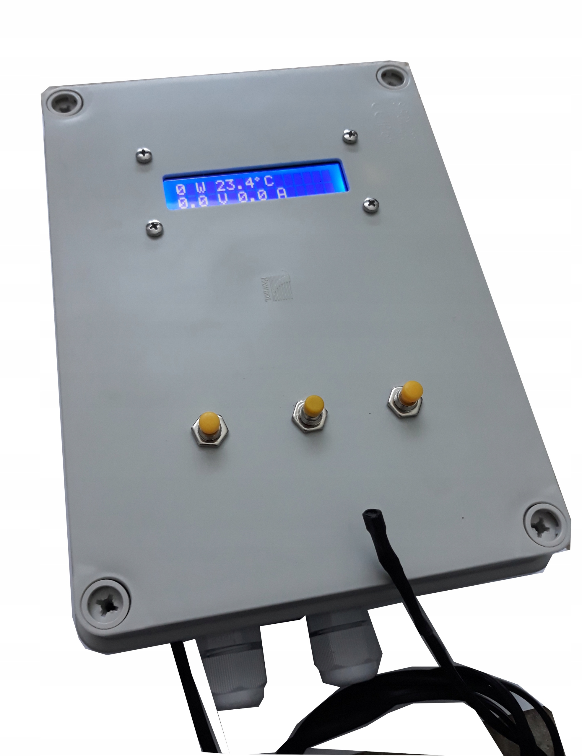 Na czytelnym wyświetlaczu LCD, wyświetlana jest aktualna moc oddawana do grzałki, temperatura wody, napięcie PV oraz prąd obciążenia. Urządzenie posiada chłodzenie aktywne zamontowanym w obudowie wentylatorem. W odróżnieniu od innych tego typu regulatorów nie posiada dużego radiatora znajdującego się za obudową, a jedynie niewielki radiator wewnątrz obudowy, który dopasowany jest do wydzielanego na tranzystorach ciepła, tak aby skutecznie je odprowadzić i zapewnić odpowiednie chłodzenie stopnia mocy.