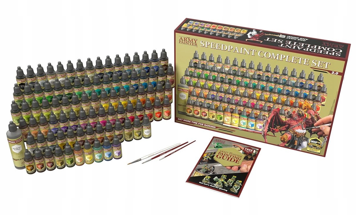 Zestaw The Army Painter: Speedpaint 2.0 - Complete Set to prawdziwe Eldorado! Znajdziesz tu wszystkie opracowane dotychczas farby jednowarstwowe, w tym pełen zestaw farb Speedpaint Metalics! Dzięki współpracy z takimi kanałami, jak Dana Howl, Watch It Paint It czy Goobertown Hobbies specjaliści z Army Paintera stworzyli dwanaście nowych kolorów, które wzbogacą każdą paletę! Ulepszony skład pozwala osiągnąć znakomite rezultaty już po jednej warstwie! Tylko tyle wystarczy, by uzyskać efekt farby bazowej, cienia oraz rozjaśnienia. Przyśpiesz malowanie swojej armii i miej więcej czasu na granie!
