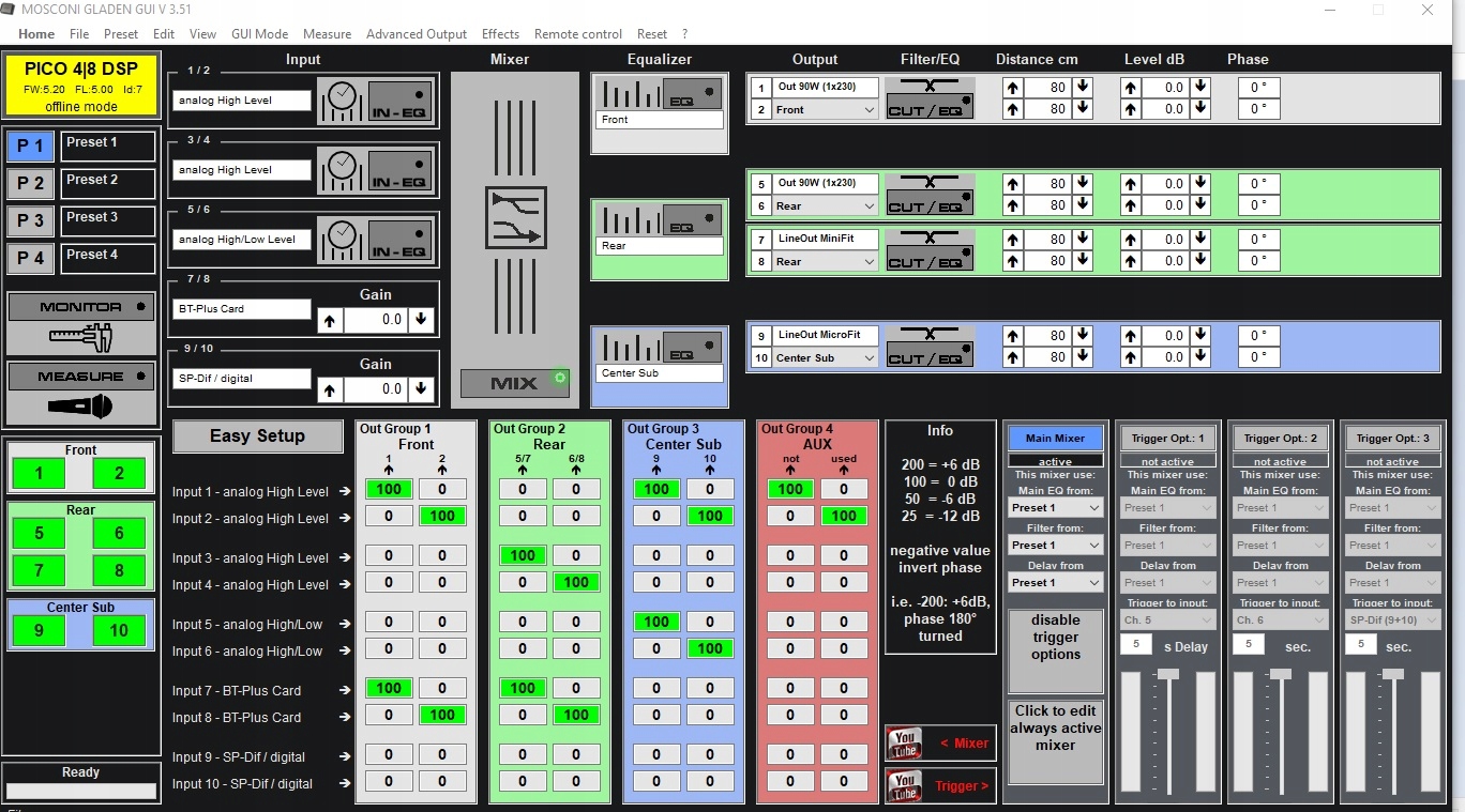 Четыре аналоговых входа высокий или низкий уровень, а также цифровой вход TOSLINK и вход BLUETOOTH и шесть аудиовыходов от процессора он дает много возможностей для подключения к заводскому радио.