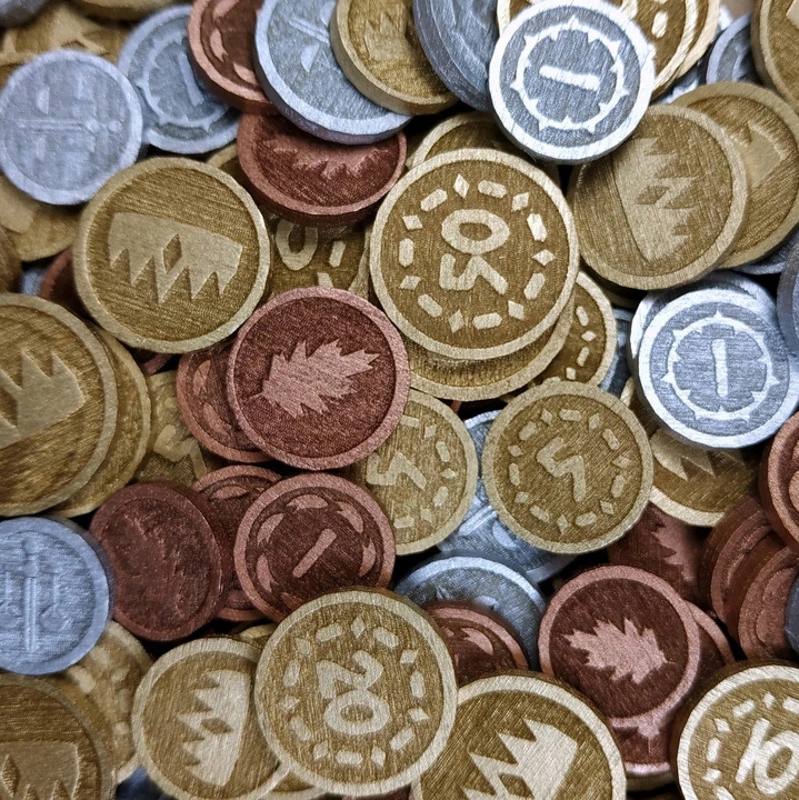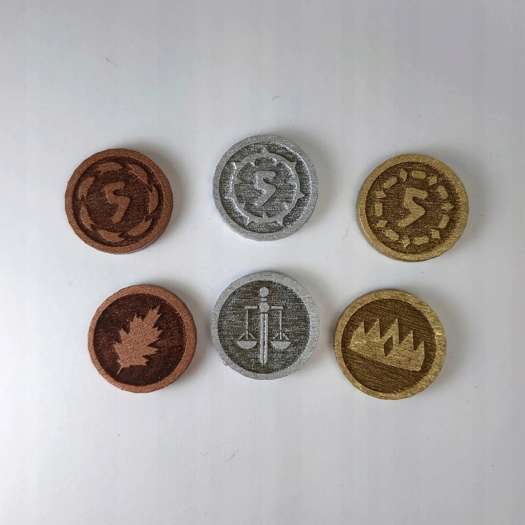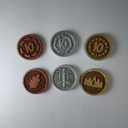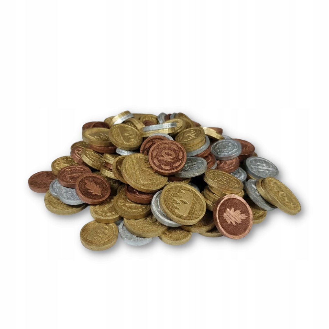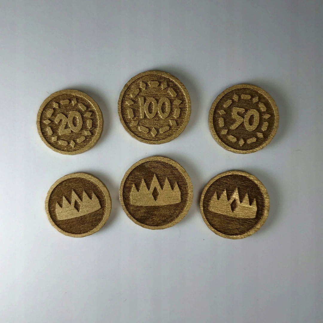 Żetony wzorowane są na systemie monetarnym ze świata Warhammera, ale świetnie sprawdzają się też w innych uniwersach z motywem średniowiecznym np. w DnD. W zestawie znajduje się po kilkadziesiąt sztuk miedziaków (pensy), srebrników (szylingi) i złotych monet (korony). Każdy z kolorów posiada kilka nominałów, opisanych odpowiednią liczbą oraz różniących się wielkością.