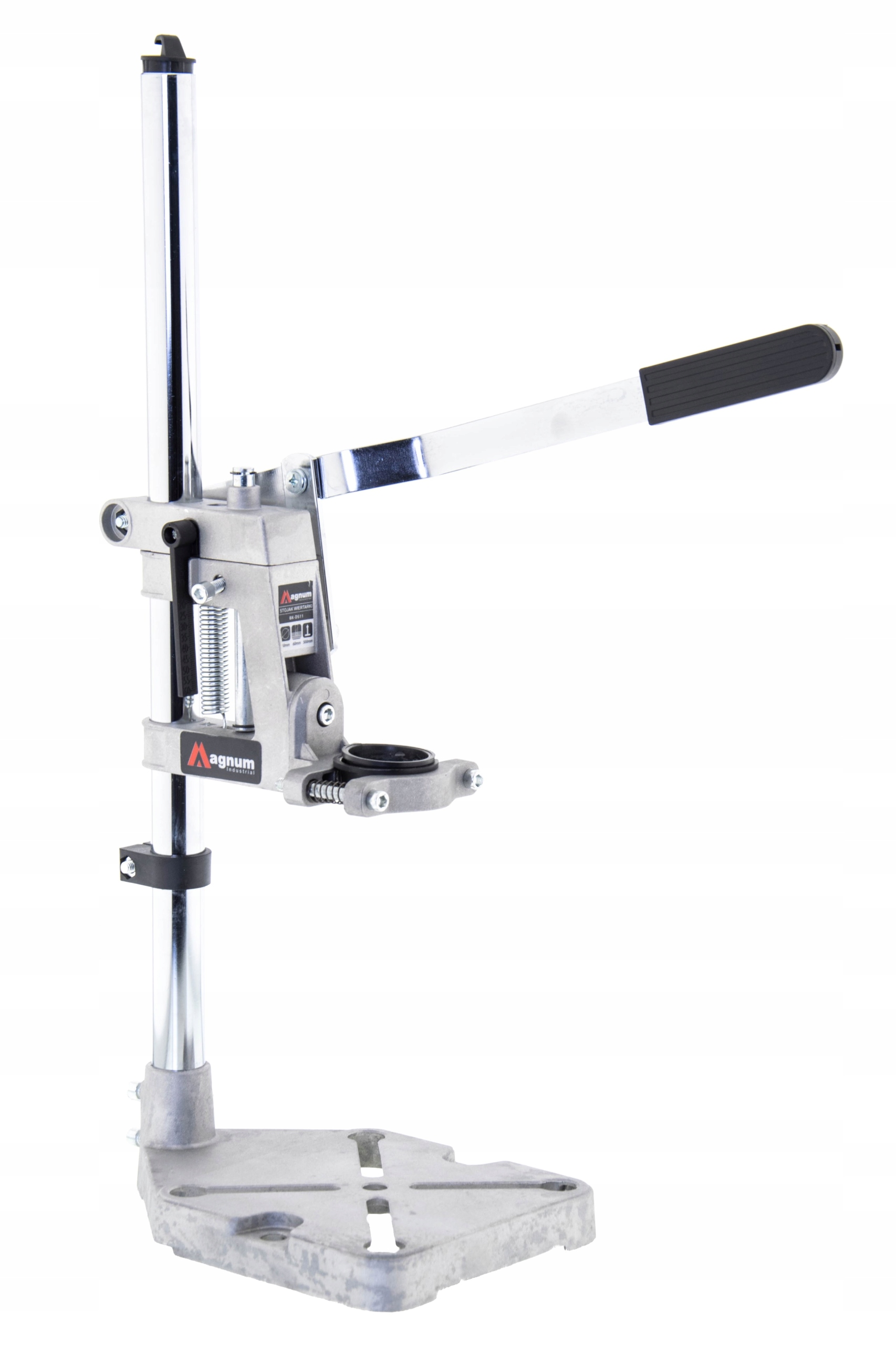 Statyw marki MAGNUM, umożliwiający montaż wiertarki w celu wykonywaniu precyzyjnych odwiertów. Stojak posiada regulację wysokości oraz kąta nachylenia uchwytu. Dodatkowo stopa statywu posiada otwory umożliwiające montaż imadła maszynowego.