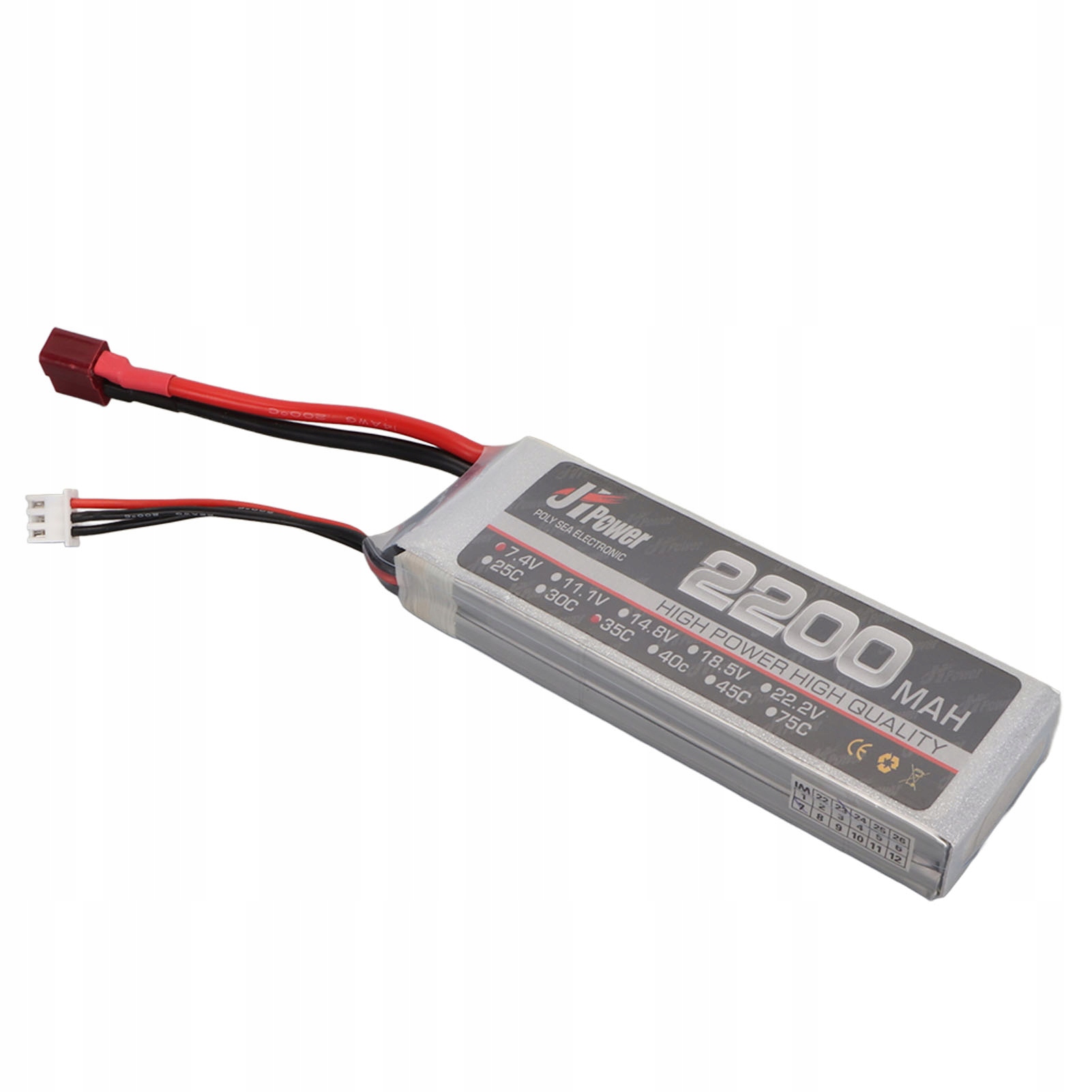 4. Dane techniczne: Ta bateria litowa do samolotu RC o napięciu 7,4 2S, wtyczce ładowania głowicy balansującej XH, szybkości rozładowania 35°C i pojemności 2200 mAh, jest bezpieczna w użyciu.