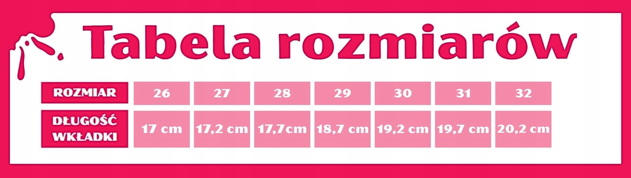 Buciki mają rozmiarówkę pozaeuropejską, dlatego przy wyborze prosimy kierować się długością wkładki – szczegółowe wymiary podajemy w opisie produktu. Taki sposób doboru pozwala na precyzyjne dopasowanie obuwia do stópki Twojego dziecka.