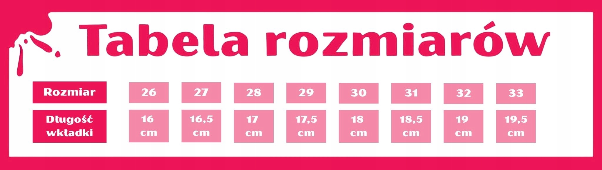 Buciki mają rozmiarówkę pozaeuropejską, dlatego przy wyborze prosimy kierować się długością wkładki – szczegółowe wymiary podajemy w opisie produktu. Taki sposób doboru pozwala na precyzyjne dopasowanie obuwia do stópki Twojego dziecka.