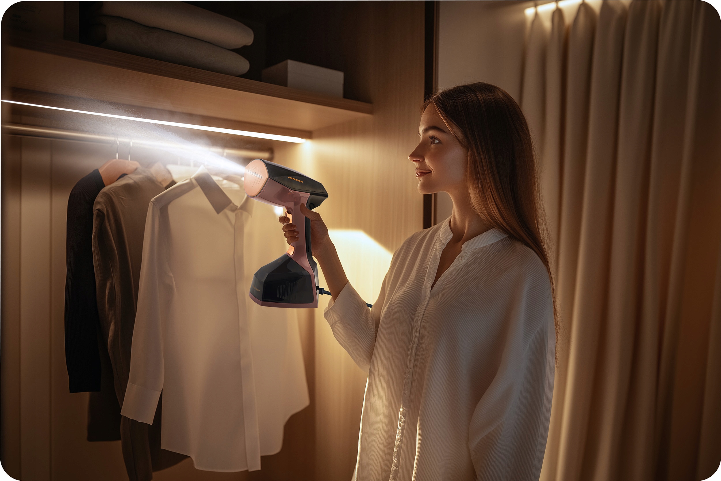Steamer эффективно решит проблему складок на одежды, штор и диванов.