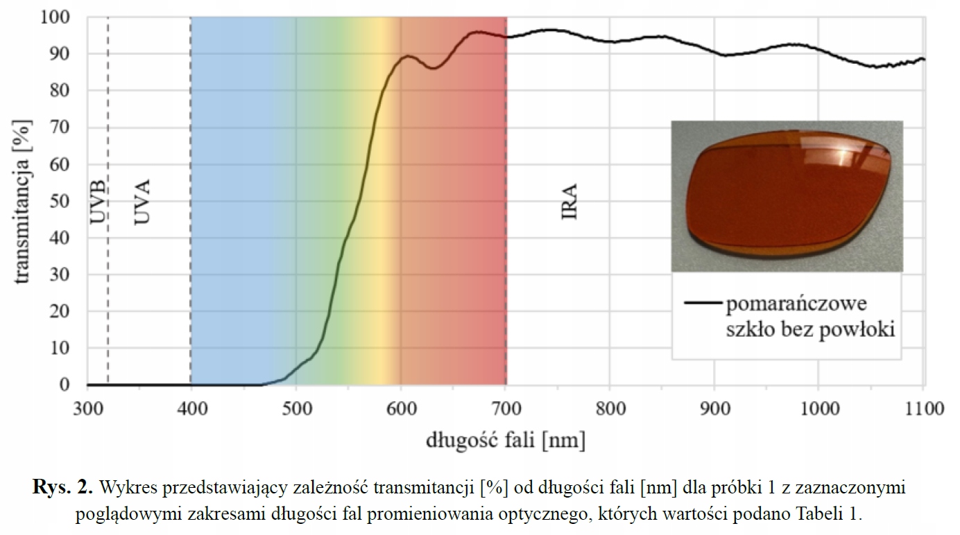 Celem badania było określeni transmitancji soczewek okularowych w zakresie długości fali 300-1100 nm. Pomiary wykonano przy użyciu spektrofotometru UV-Vis Evolution 220. Dla człowieka światło widzialne zawiera się w przybliżeniu w zakresie długości fal promieniowania elektromagnetycznego 380-780 nm. Poniższa tabela prezentuje zakresy długości fal składowych promieniowania optycznego: promieniowanie ultrafioletowe (UVR), światło widzialne (VL), podczerwień (IR).