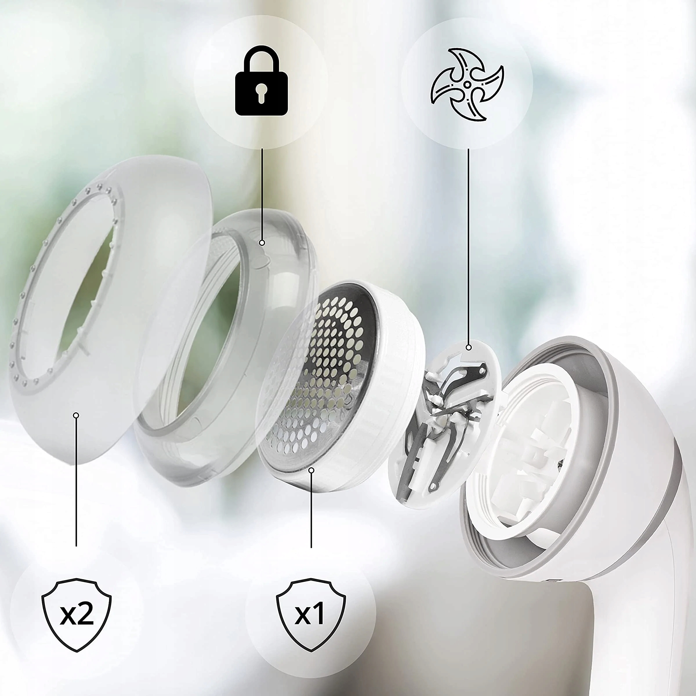 Pojemnik na odpady jest przezroczysty, dzięki czemu łatwo sprawdzisz stan zapełnienia urządzenia. W celu opróżnienia pojemnika wystarczy odkręcić wieko i wymieść zawartość. Głowica wyposażona jest w różne nakładki, które zwiększają lub zmniejszają dystans pomiędzy ostrzami a materiałem, co większa uniwersalność golarki dla materiałów typu wełna, bawełna, tkaniny syntetyczne, poliester itp.