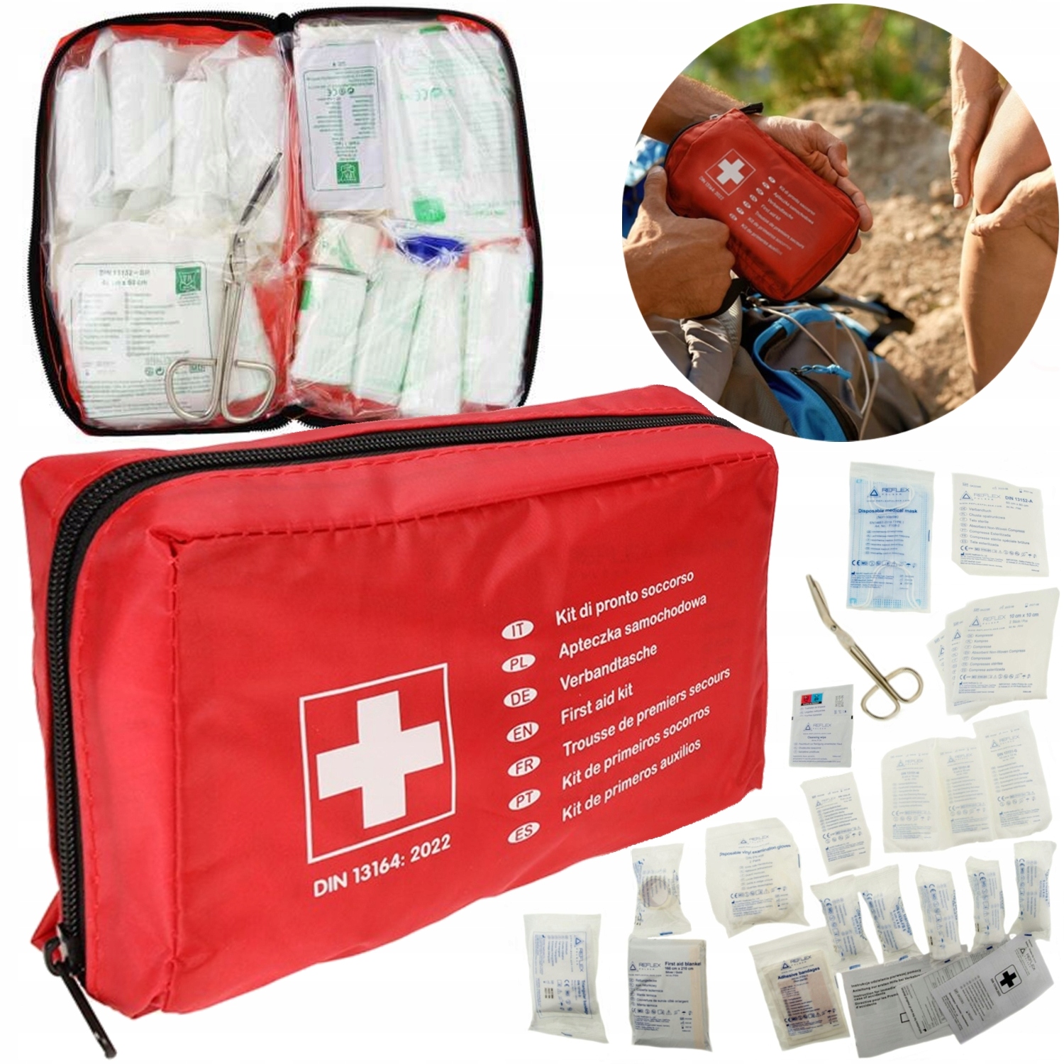 Zapakowana w solidną, wodoodporną torbę z tkaniny, apteczka jest przygotowana do użycia w różnych warunkach, zarówno w podróży, jak i w codziennym użytkowaniu.