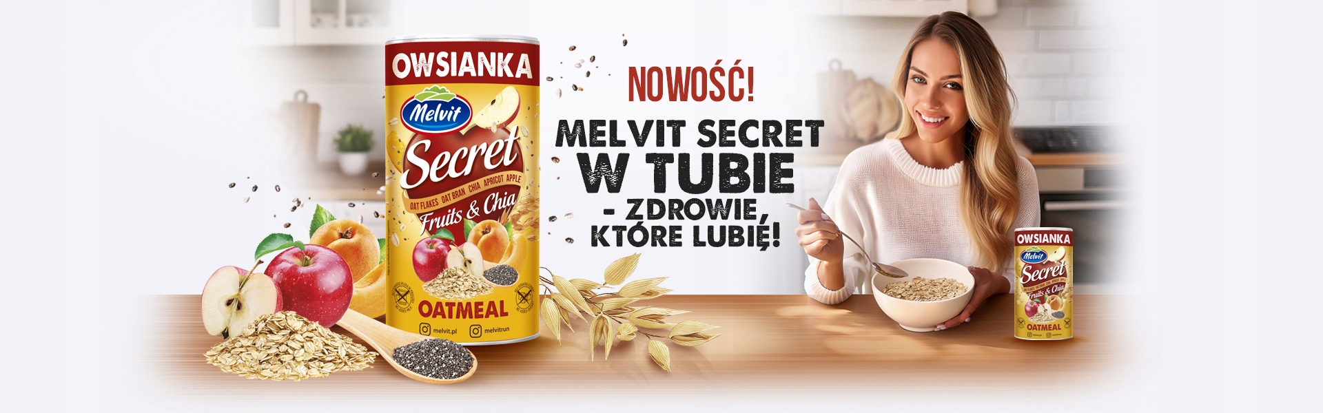 Melvit przedstawia nowość – Secret Fitness Owsiankę z Chia i Owocami w nowej, super wygodnej 500-gramowej tubie! Otwórz tubę i odkryj sekretne super moce na śniadanie, które dodadzą energii na cały dzień!