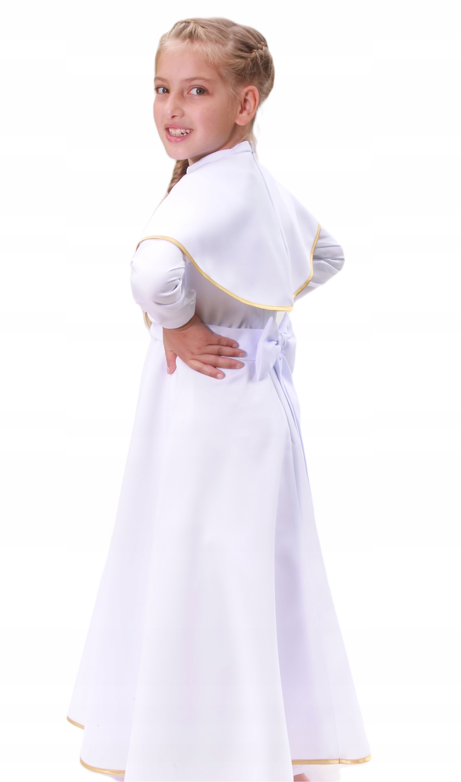 ALBA komunijna dziewczęca długa firmy SOMIR ze złotymi dodatkami w rozmiarze 128 M