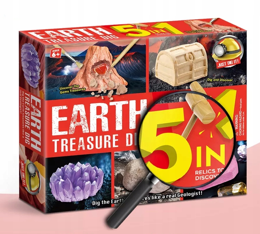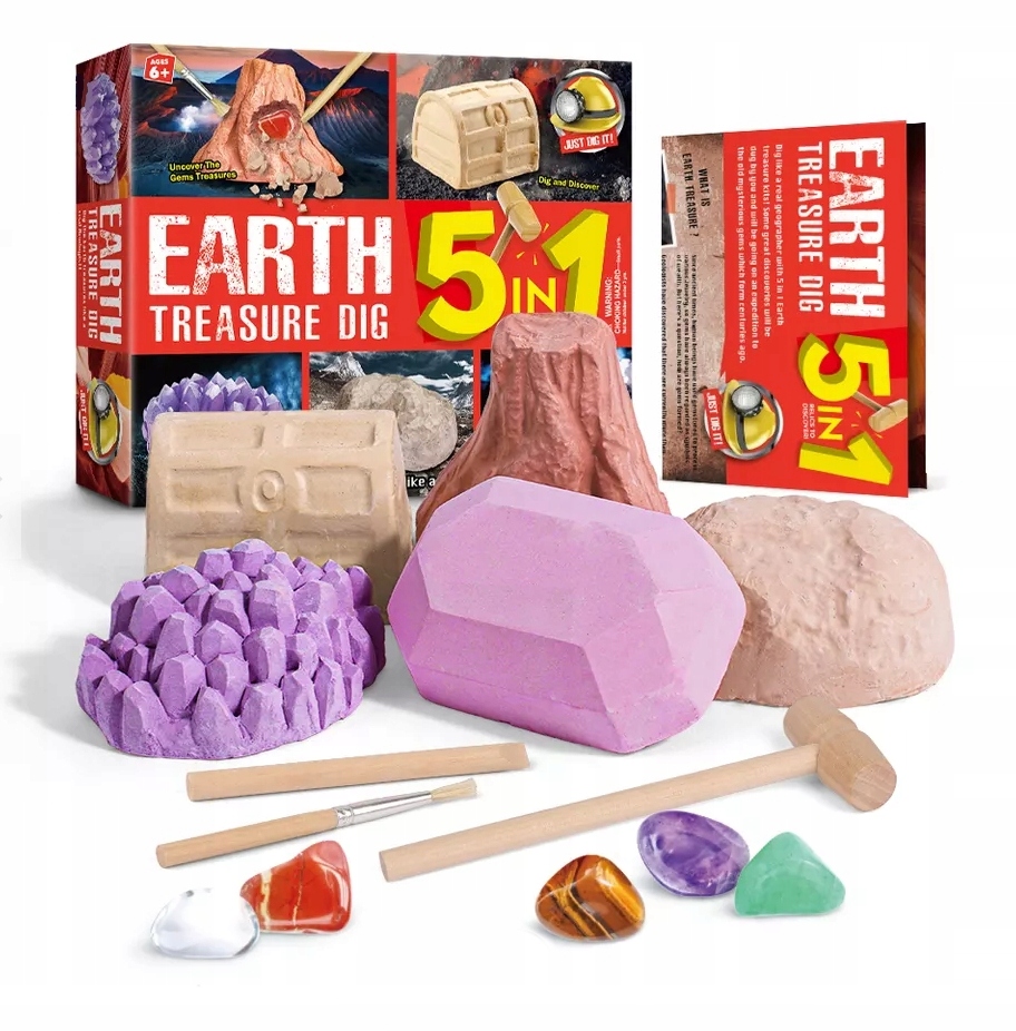 Zestaw dla młodego odkrywcy. W bryłach ukryte są skarby, które należy wykopać przy pomocy załączonych do zestawu narzędzi. Ciekawa zabawa dla młodych kolekcjonerów łącząca w sobie twórczą pracę z pasją odkrywcy. Zabawa w poszukiwanie mitycznych skarbów pobudza wyobraźnię i stymuluje do samodzielnego zdobywania wiedzy.