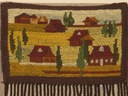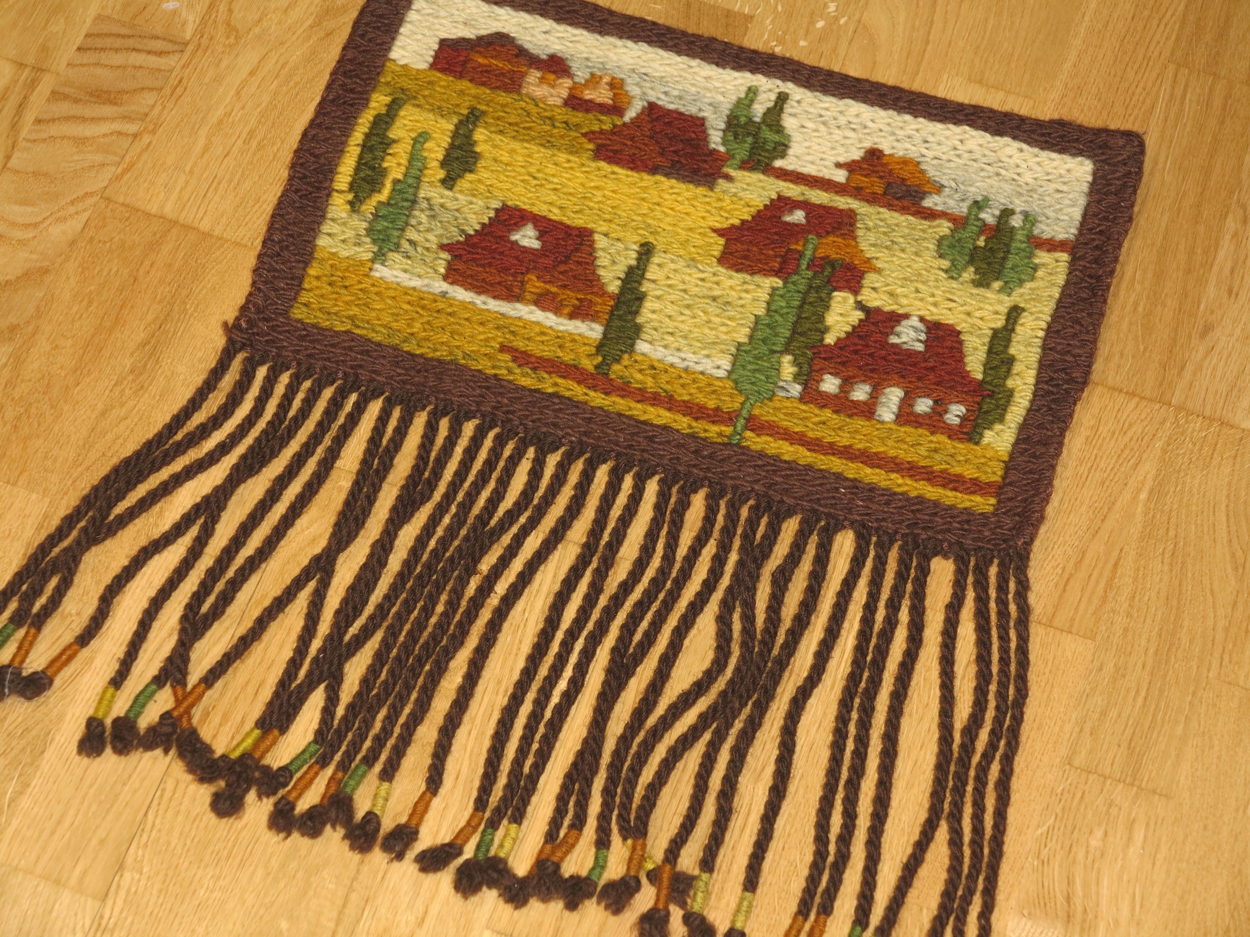 PIĘKNY, RĘCZNIE TKANY, FOLKOWY CZYSTO WEŁNIANY GRUBY KILIM ŚCIENNY Z GRUBYMI FRĘDZLAMI- WIEJSKA OSADA