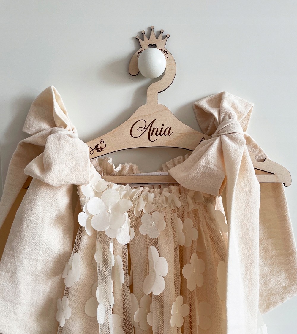 Wieszak został wykonany z największą starannością - grawer jest precyzyjnie wycinany laserowo, a następnie wieszak jest ręcznie szlifowany, aby zapewnić gładkość i bezpieczeństwo dla delikatnych ubrań dziecięcych.Odcień drewna i jego usłojenie mogą się lekko różnić od przedstawionego na zdjęciu. Wynika to z indywidualnych ustawień monitora oraz cech charakterystycznych materiałów naturalnych.