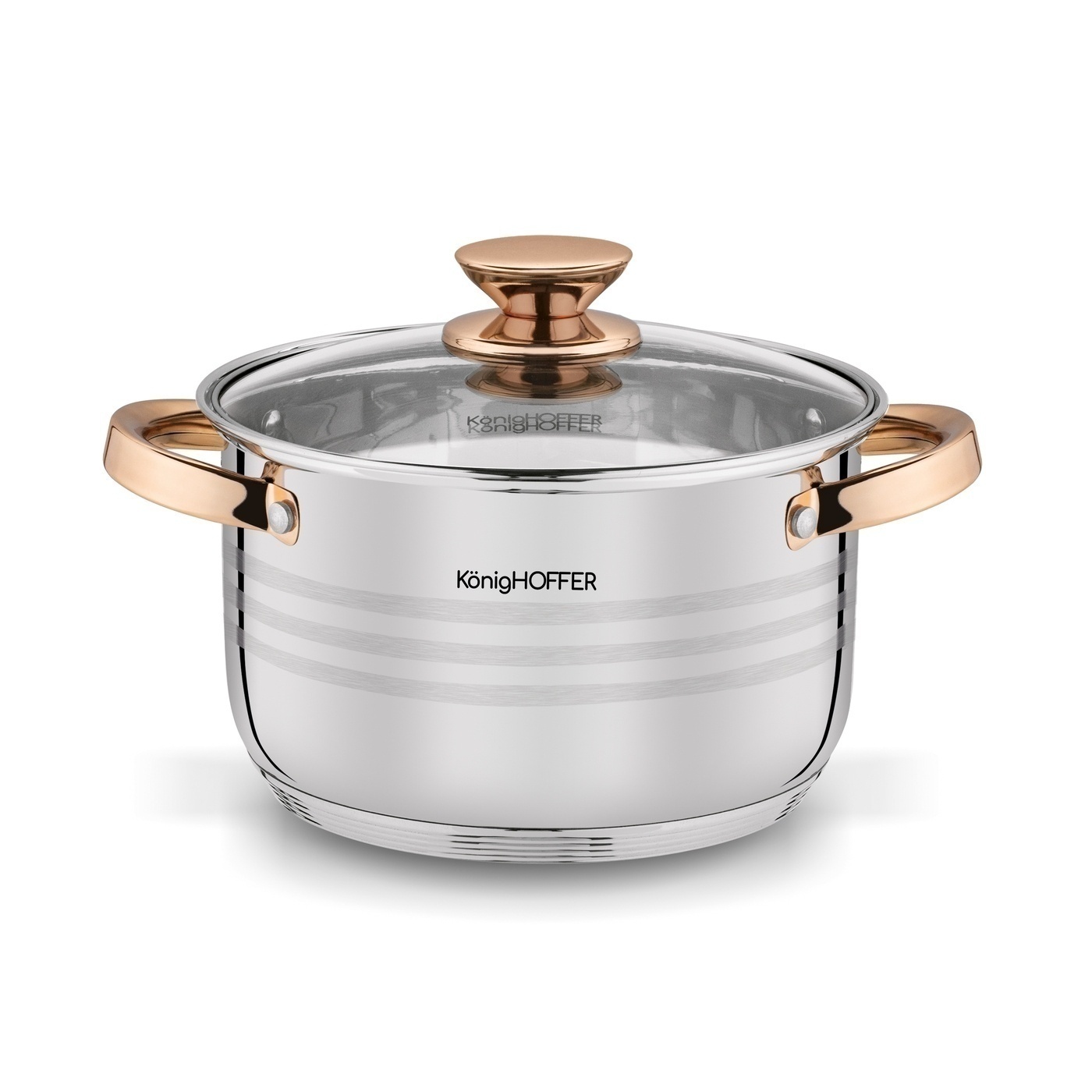Другая информация: - кастрюли из нержавеющей стали с атласными полосками, - стеклянные крышки со стальным напором и вентиляционным отверстием, - ручки и ручки медного цвета, стиль розового золота, - сковорода с трехслойным антипригарным покрытием, - только мытье ручной