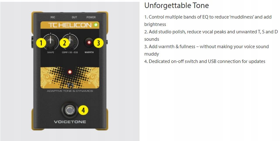 VoiceTone T1 dodaje połysku Twojemu głosowi za pomocą studyjnej klasy dynamiki oraz equalizera. To jak posiadanie własnego inżyniera dźwięku na każdym występie, który automatycznie reaguje na Twój głos i odpowiednio dobiera nastawy korektora barwy, kompresora i de-essera, czyniąc Twój głos wyjątkowo ekscytującym. Teraz możesz dodać sobie tego studyjnego blasku podczas śpiewania na żywo bez wielogodzinnego kręcenia gałkami w tych wszystkich urządzeniach, które normalnie się stosuje by osiągnąć „ten dźwięk”.
