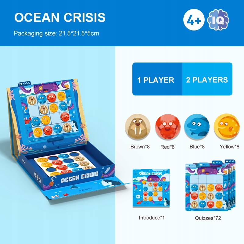 To Sudoku 4 x 4 zawiera karty do gry Sudoku, żetony w postaci kolorowych krążków ze zwierzątkami (magnetyczne) oraz instrukcję w języku angielskim.