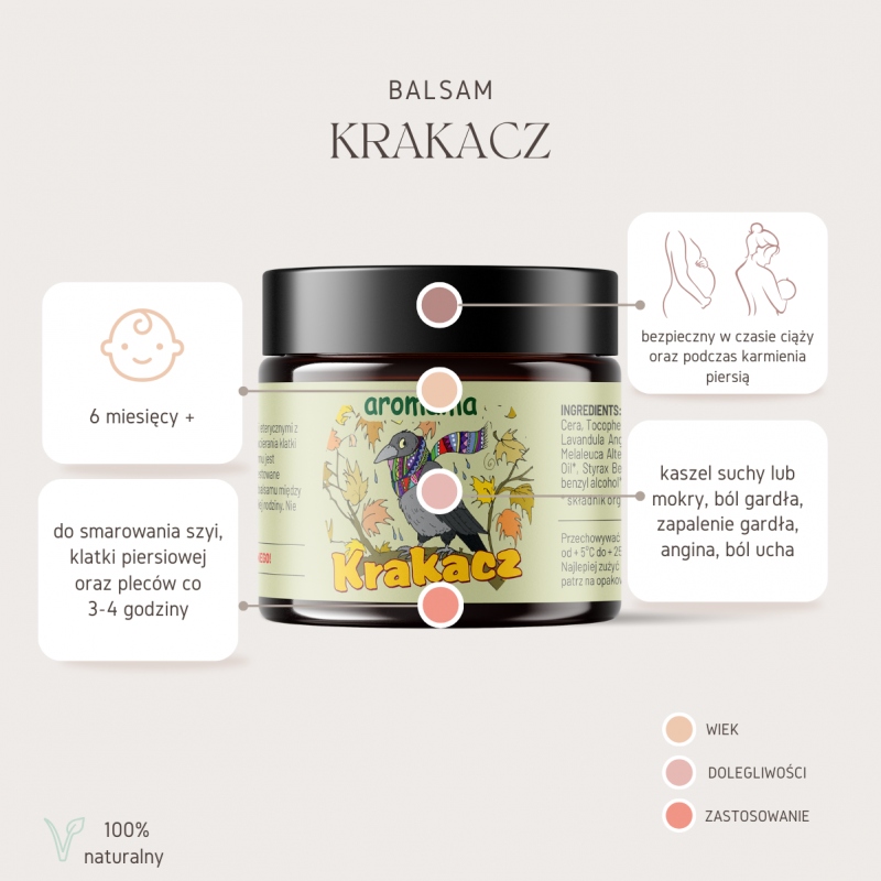 Z kolei Balsam Krakacz, bogaty w naturalne składniki takie jak masło mango i olej migdałowy, jest przeznaczony do nacierania klatki piersiowej, pleców i stóp, zapewniając nawilżenie i odżywienie skóry. Wzbogacony o siedem olejków eterycznych, balsam pomaga łagodzić dolegliwości związane z przeziębieniem, takie jak kaszel czy ból gardła.