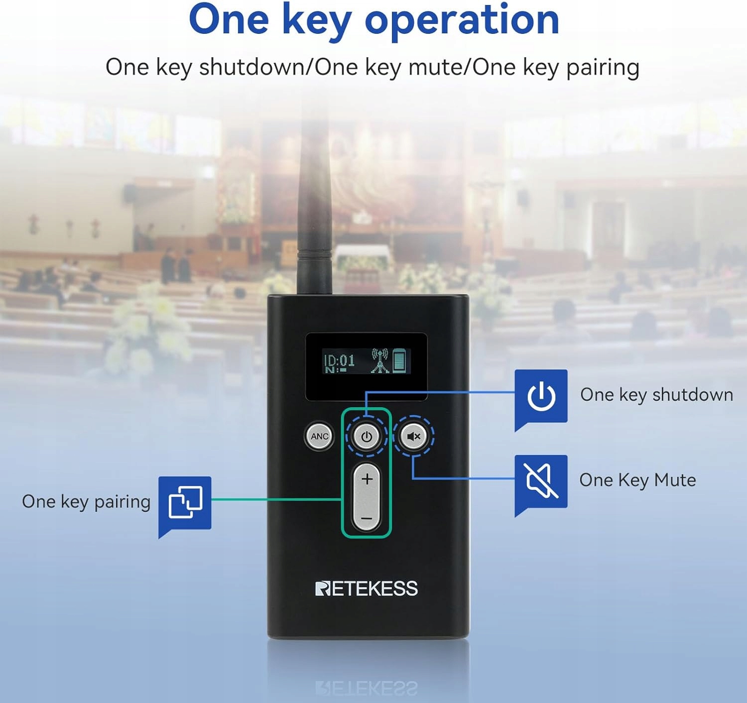 Когда у вас много приемников, может потребоваться много времени, чтобы отключить их один за другим после завершения события. Просто нажмите и удерживайте кнопку " - " передатчика в течение примерно 5 секунд, и все приемники будут отключены в в то же время, позволяя гидам легко и эффективно управлять устройствами в конце экскурсии.
