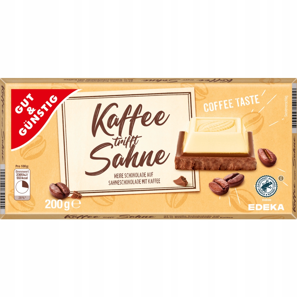 Gut & Gunstig kawowo śmietankowa to niemiecka czekolada. Wysokojakościowa czekolada mleczna jest znana w całym kraju. Najpopularniejsza spośród tych czekolad. Niepowtarzalny smak czekolady zachwyci wielu koneserów czekolady.