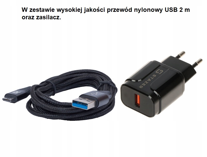 W zestawie znajduje się przewód USB 2 m oraz zasilacz.