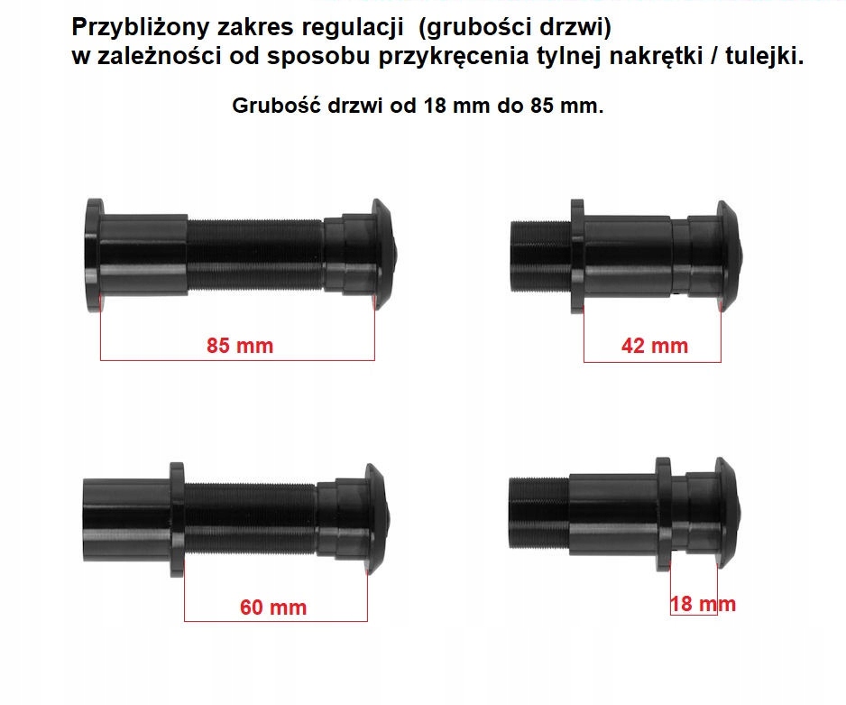 Kamera Wi-Fi do drzwi nowej generacji. Urządzenie montuje się w otworze w drzwiach po zwykłym wizjerze. Pasuje do drzwi o grubości od 18 do 85 mm ( w zależności od sposobu/kierunku przykręcenia tylnej nakrętki).