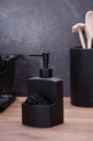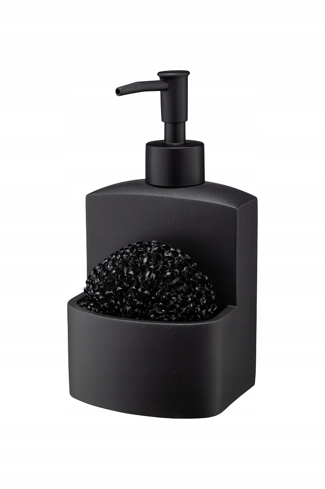 Prezentowany dozownik na płyn do mycia naczyń jest nie tylko designerski, ale również bardzo praktyczny. Posiada wygodną w użytkowaniu pompkę, a dodatkowo ma dużo miejsca do przechowywania gąbki do mycia. Jedna myjka w czarnym kolorze znajduje się w zestawie. Czarny, kamienny dozownik jest również ciężki, przez co stabilnie leży na kuchennym blacie.