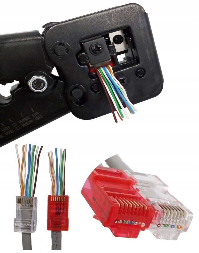 Zestaw narzędzi do budowy sieci komputerowych również w technologii Pass Through (wtyków przelotowych):
