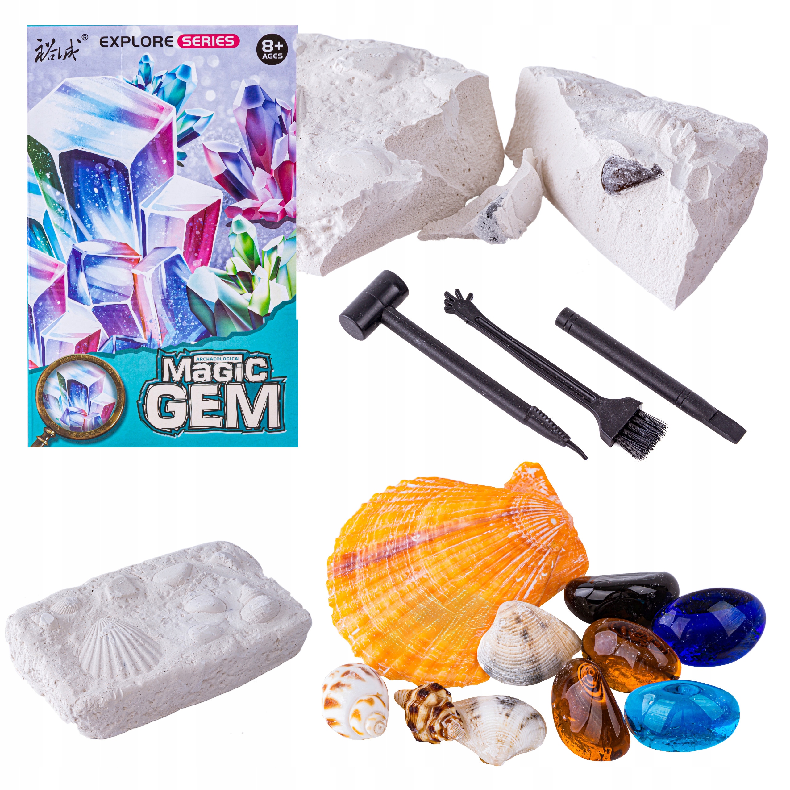 Zestaw to nie tylko zabawa, ale również prawdziwe wyzwanie dla małych poszukiwaczy skarbów. Dziecko będzie miało okazję wykopać z bryły za pomocą trzech narzędzi różnorodne, drogocenne kamienie i muszelki. Świetna zabawa i nauka gwarantowana!