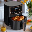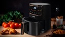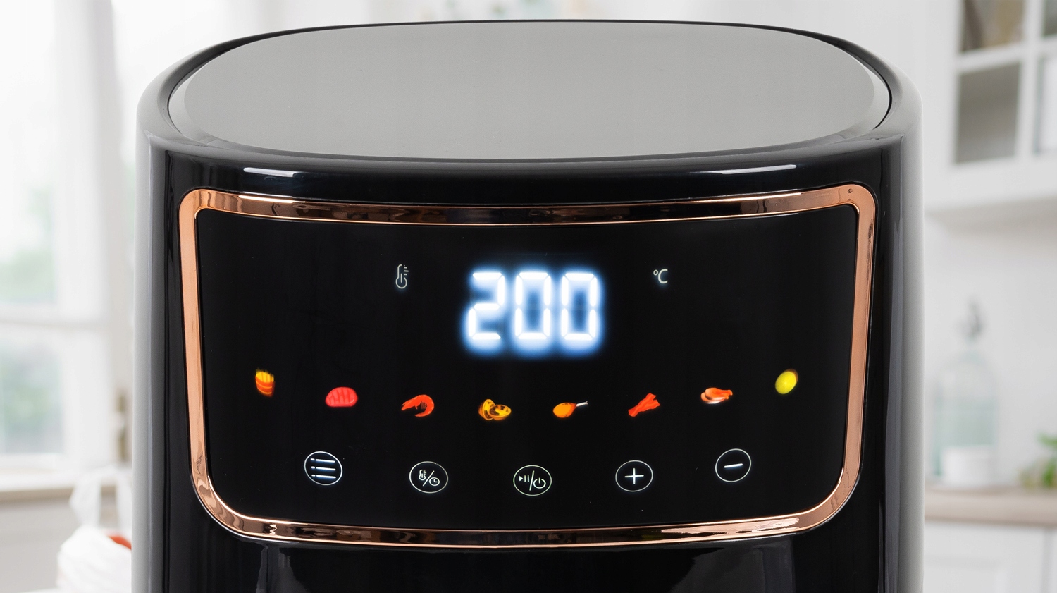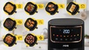 Air Fryer MINK NDY-AF513R posiada bardzo czytelny, podświetlany panel dotykowy, pozwalający szybko wybrać preferowany program automatyczny lub skorzystać z trybu manulanego, a także w dowolnym momencie zmienić czas pracy i zadaną temperaturę. Ikony przyporządkowane do każdego z trybów są bardzo duże i wyraźne, dzięki czemu nie będziemy mieli wątpliwości, jaki program wybieramy.