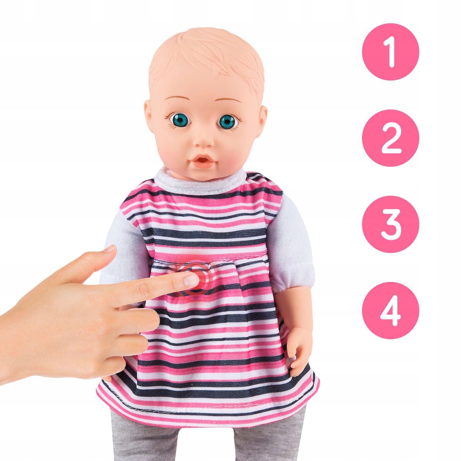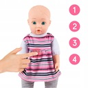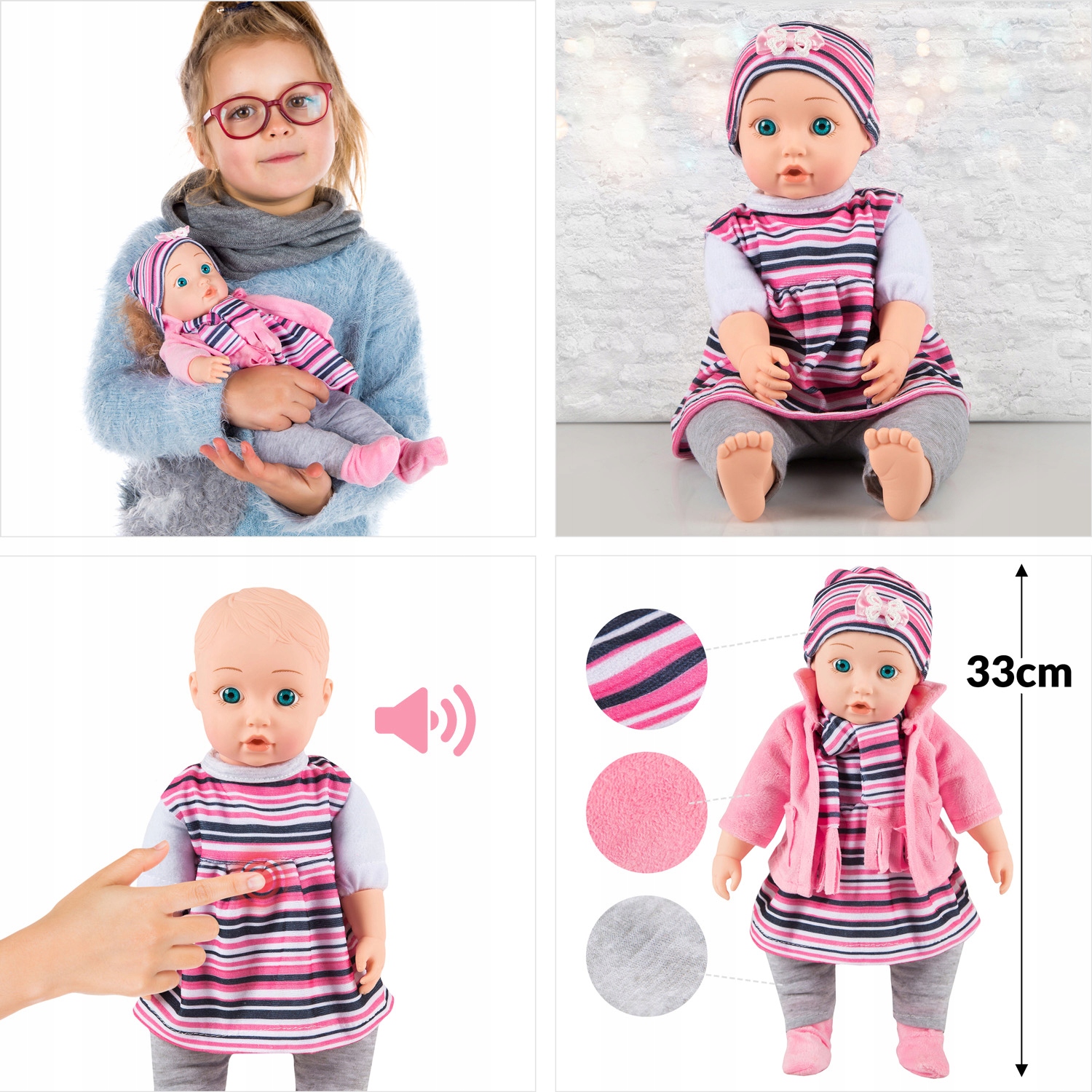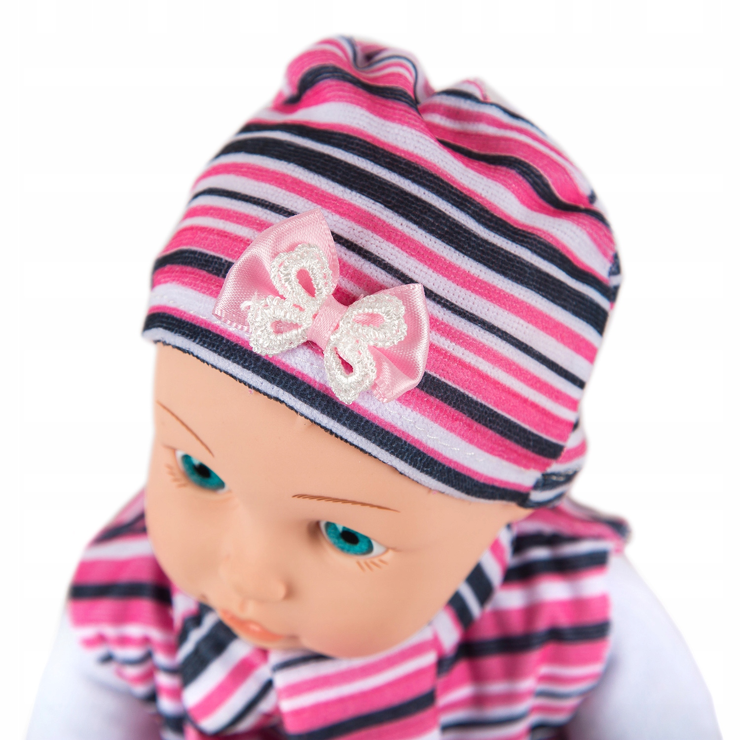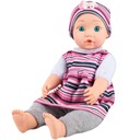 Lalka bobas ma wesołą, słodką minkę i duże oczka z pogodną buźką, wygląda jak prawdziwe dziecko.