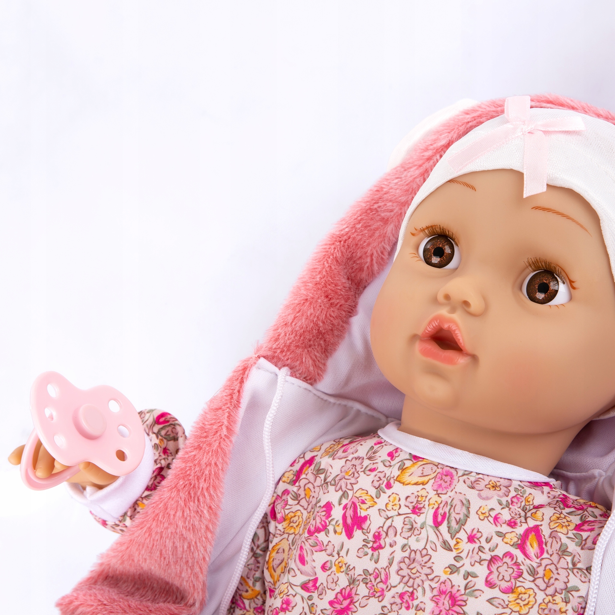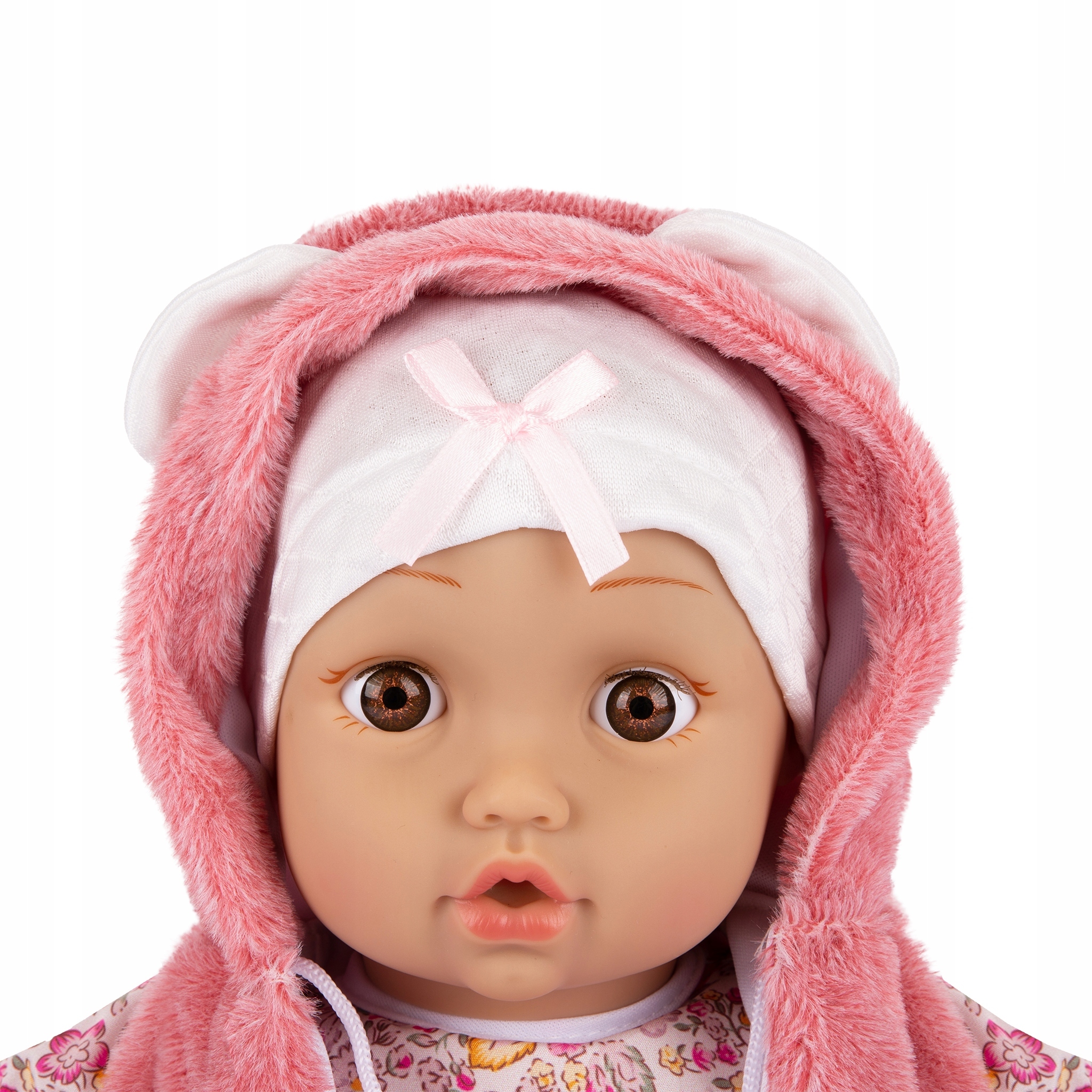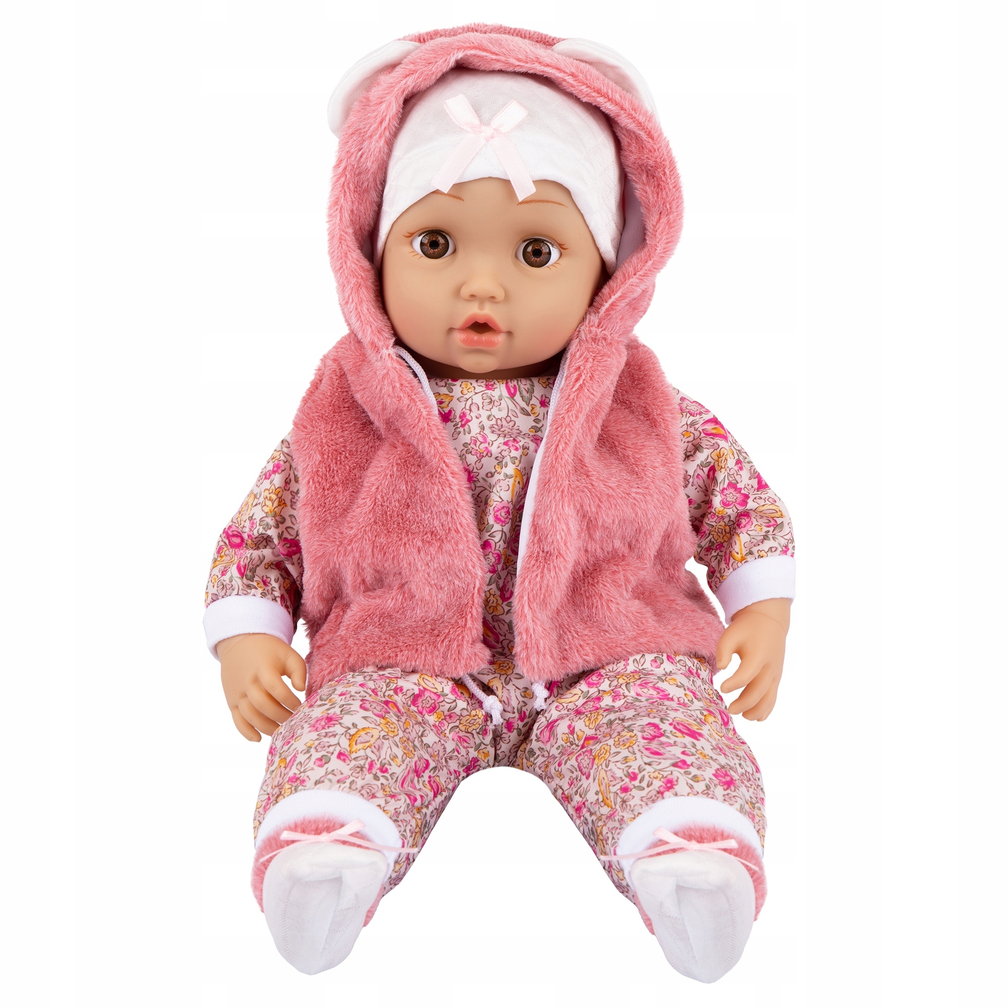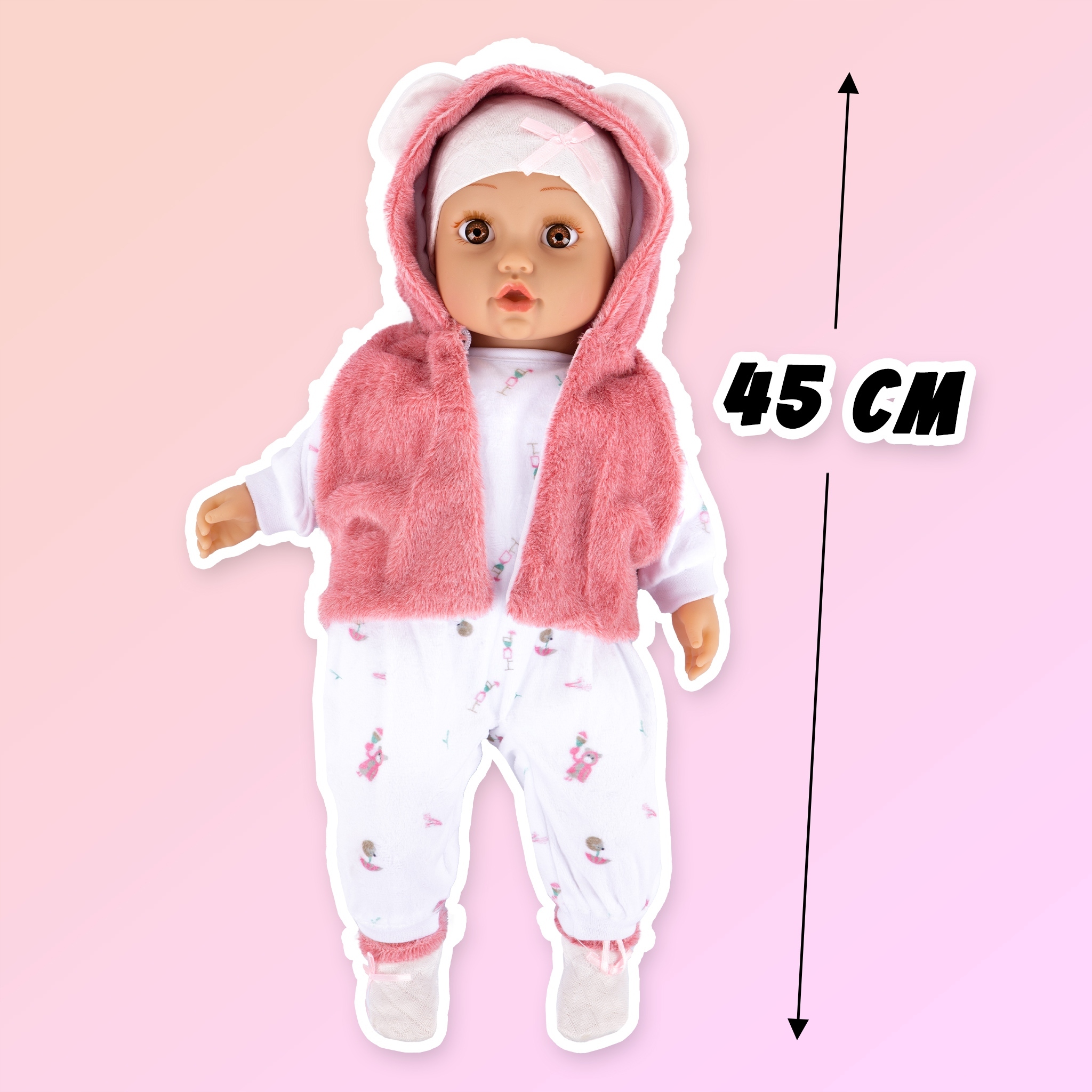 Кукла малыш имеет веселый, сладкий лицо и большие глазки с веселым смайликом. Выглядит как настоящий ребенок, одетый в нежная одежда.