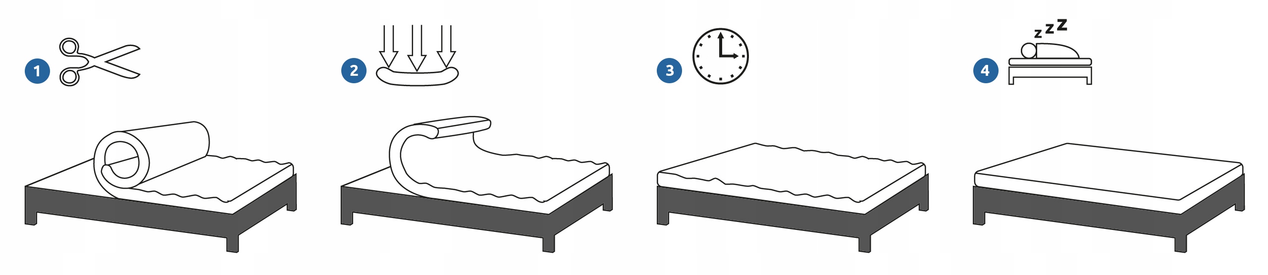 (1) после получения матраса снимите с него картонную коробку и защитную пленку. (2) место матрас на каркасе кровати. (3) Оставьте матрас на несколько часов, чтобы он достиг полного объем.