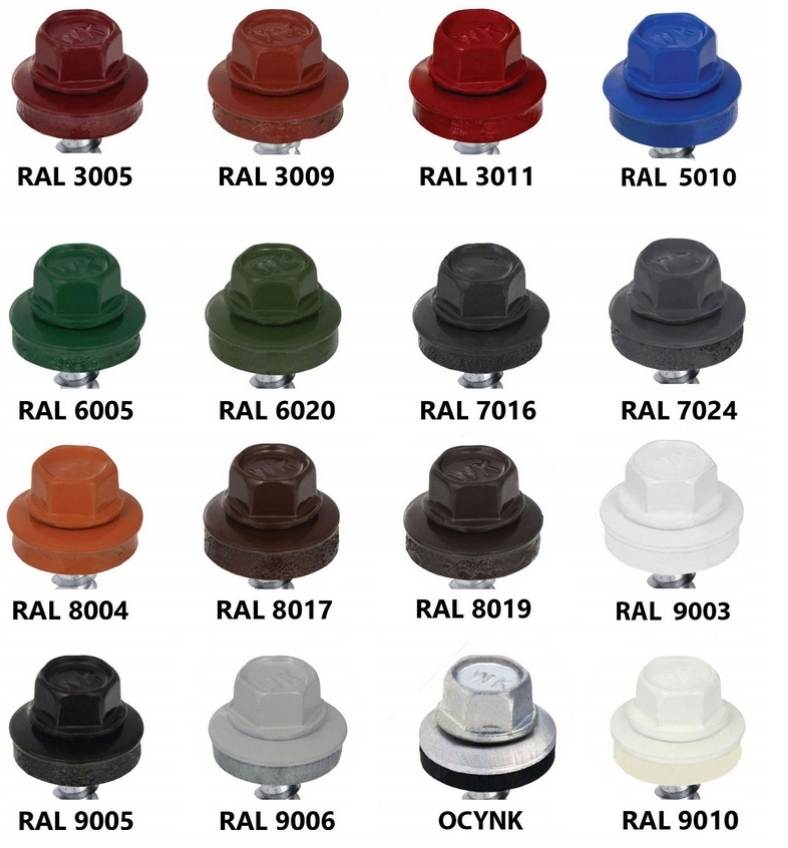 Wkręty farmerskie - samowiercące z podkładką EPDM wykonane w powłoce cynkowej do mocowania blachy, blachodachówek i obróbek blacharskich do podłoża drewnianego. Wkręty typu farmer lakierowane są wg. palety kolorów RAL