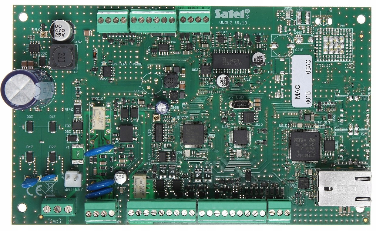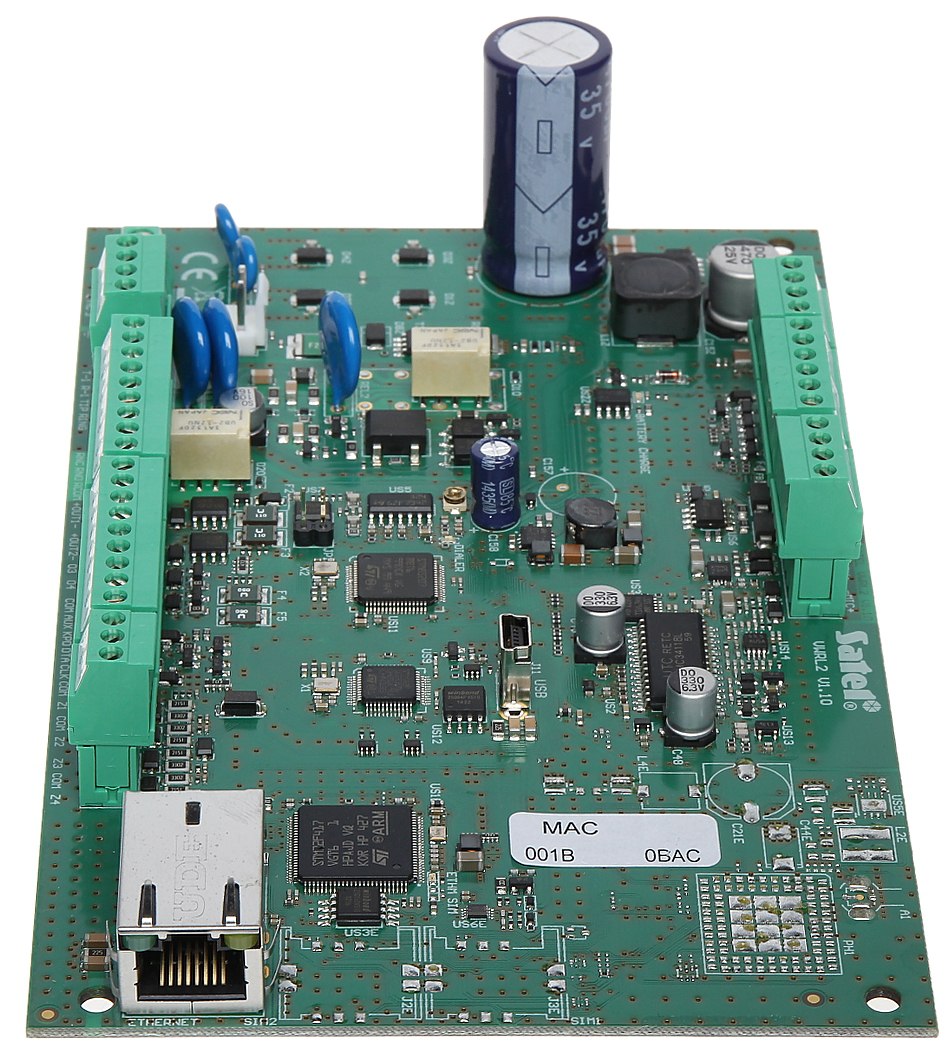 Wbudowana płyta główna integruje moduły takie jak ETHM, INT-VG, INT-AV, a także dialer PSTN, co umożliwia komunikację poprzez dwa kanały: Ethernet i PSTN. Centrala posiada 24 programowalne wejścia przewodowe oraz 5 dodatkowych wejść na płycie, a także aż 12 programowalnych wyjść, w tym 2 wyjścia wysokoprądowe i 2 niskoprądowe. Użytkownik ma możliwość podziału systemu na aż 2 strefy, w których każde wejście może być przypisane do odpowiedniej strefy.
