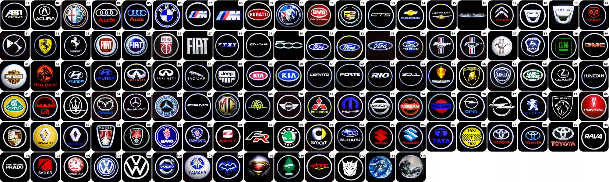 Cena dotyczy kompletnego zestawu dwóch rzutników LED z wybranym logo wraz taśmą montażową oraz magnesami. Zestaw nie zawiera baterii AAA