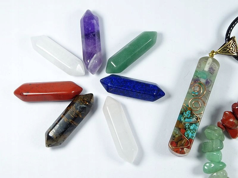 Zestaw minerałów obustronnie zakończonych szpicem to kryształ górski,jaspis czerwony,tygrysie oko,kwarc różowy,awenturyn,lapis lazuli i ametyst.