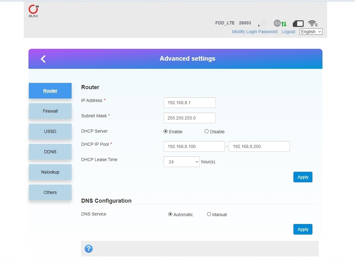 Modem jest obsługiwany i konfigurowany przez przeglądarkę internetową pod adresem 192.168.8.1. Obsługa strony startowej w języku angielskim. Możliwość obsługi urządzenia za pośrednictwem sieci WiFi. Brak blokad - modem bez brandu operatora.